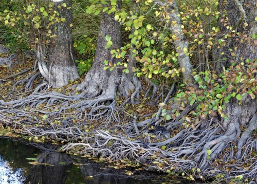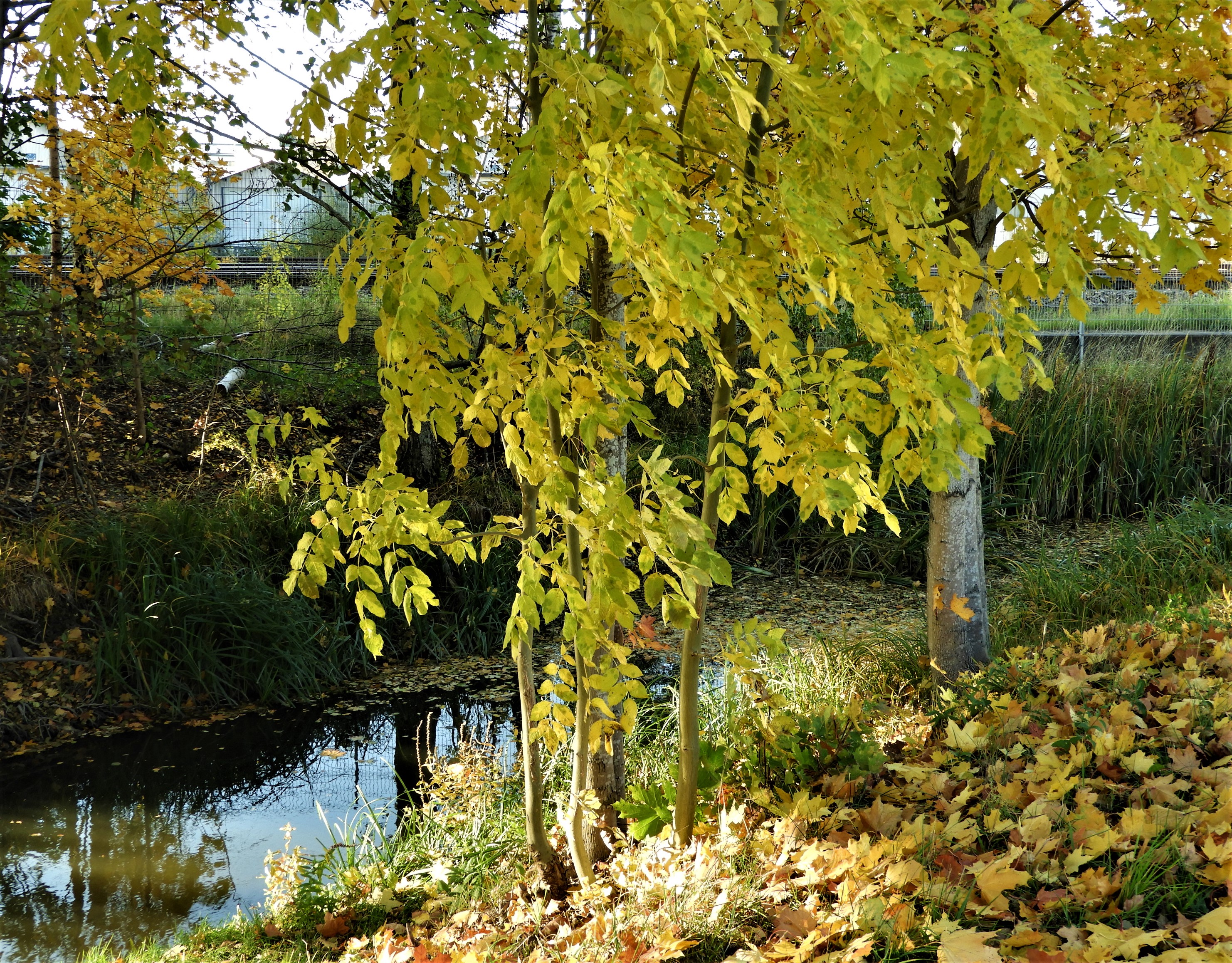 Det stora spegeln under motorvägsbron har krympt. En liten ask lyser ljusgrön och har fått behålla nästan alla sina blad, annars lär den ju vara först av lövträden med att fälla sina.