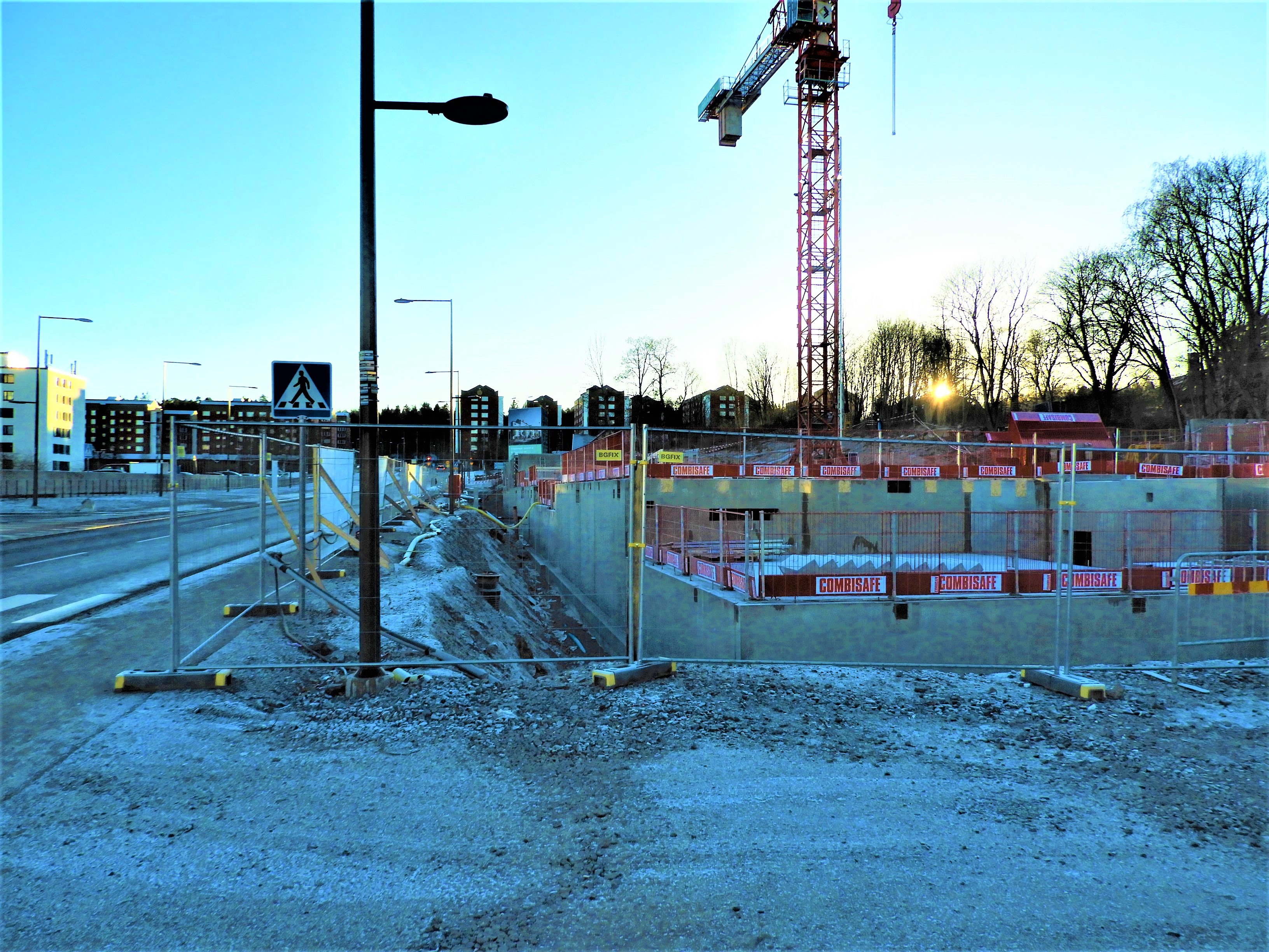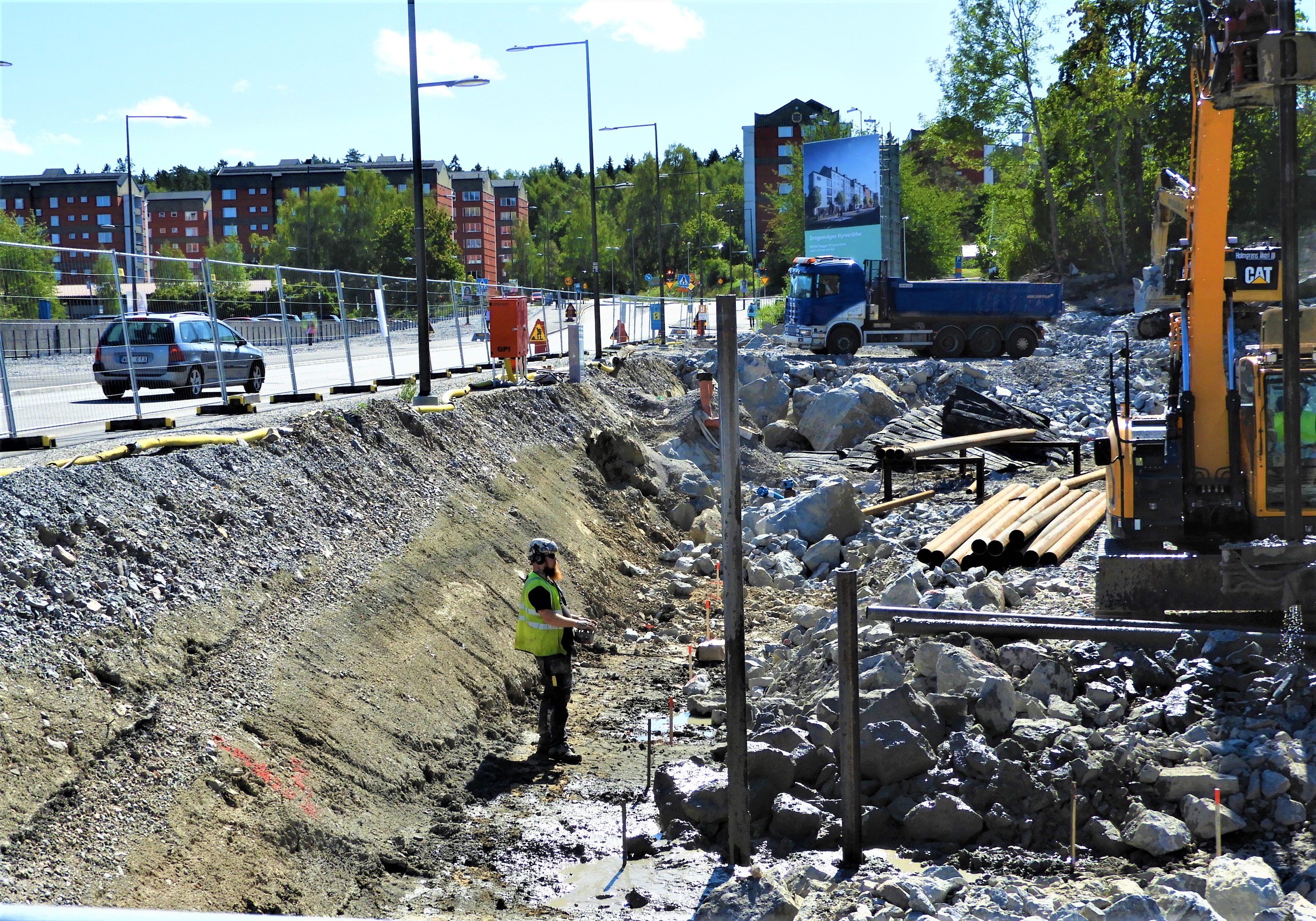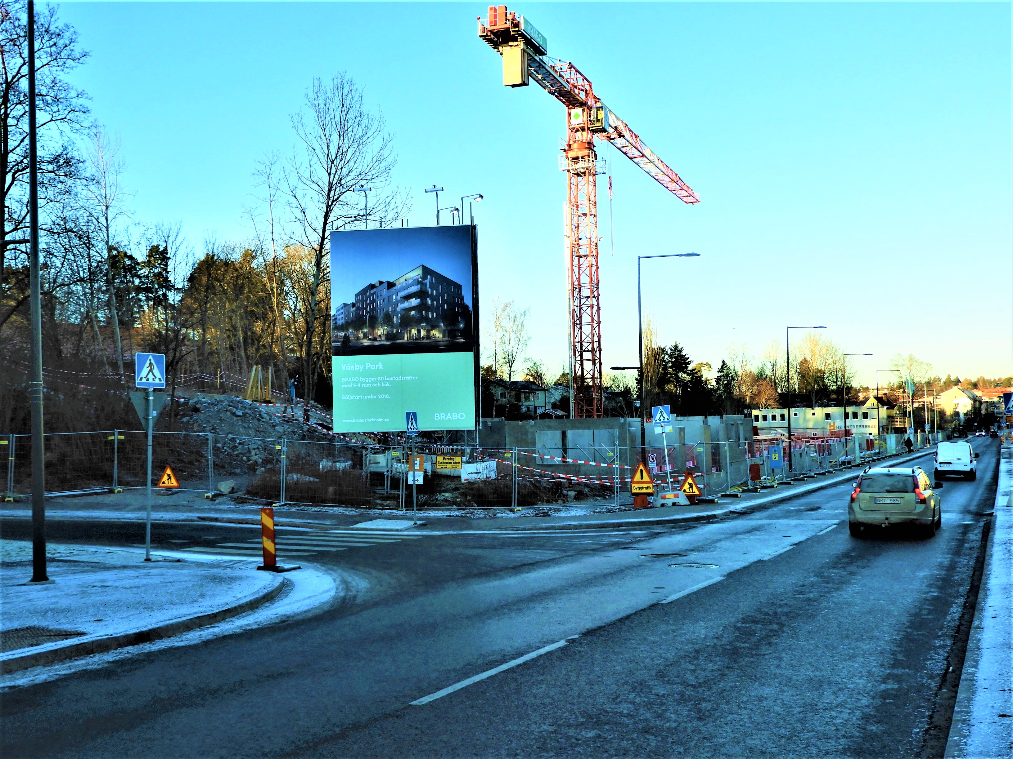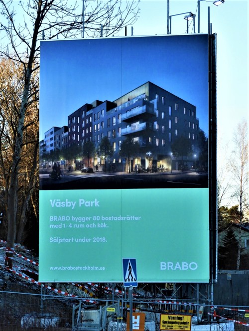Det fanns en parkremsa i vårt kvarter med buskar och träd som planterats för länge sedan och jag suckade över att den inte sköttes. Efter ett antal år var området riktigt sopigt och vi började förstå att ingen skulle uppröras eller ens märka om de skräpiga halvträden och toviga buskarna försvann. Mark kostar och är dyrast för ägaren om den är obebyggd. Den gröna remsan utmed Dragonvägen skulle visa sig vara lämplig att förtäta bebyggelsen i Väsby på och vad bygger man – hyreslägenheter. Det kan ingen klaga på det är det mest efterfrågade. Jag tog bilder på hur ”parken” såg ut när grävskoporna gått igenom markskiktet sprängt sig ner en bit i berget under. Det blev ännu djupare än på bilden.