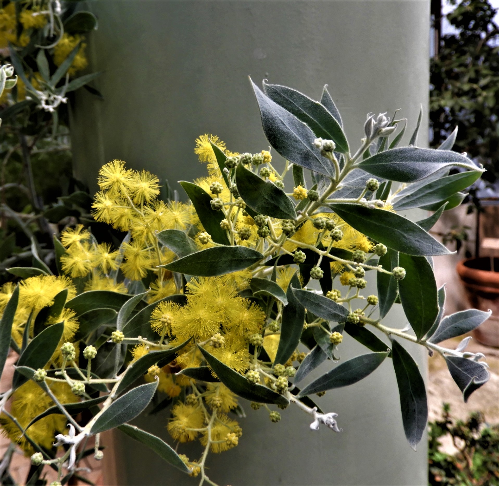 Doften här inne är nog det man blir gladast av, en mimosa, (glömde läsa namnet) är ännu nyutslagen och lutar sig mot en pelare det står Australien på. Åååkänn bara!