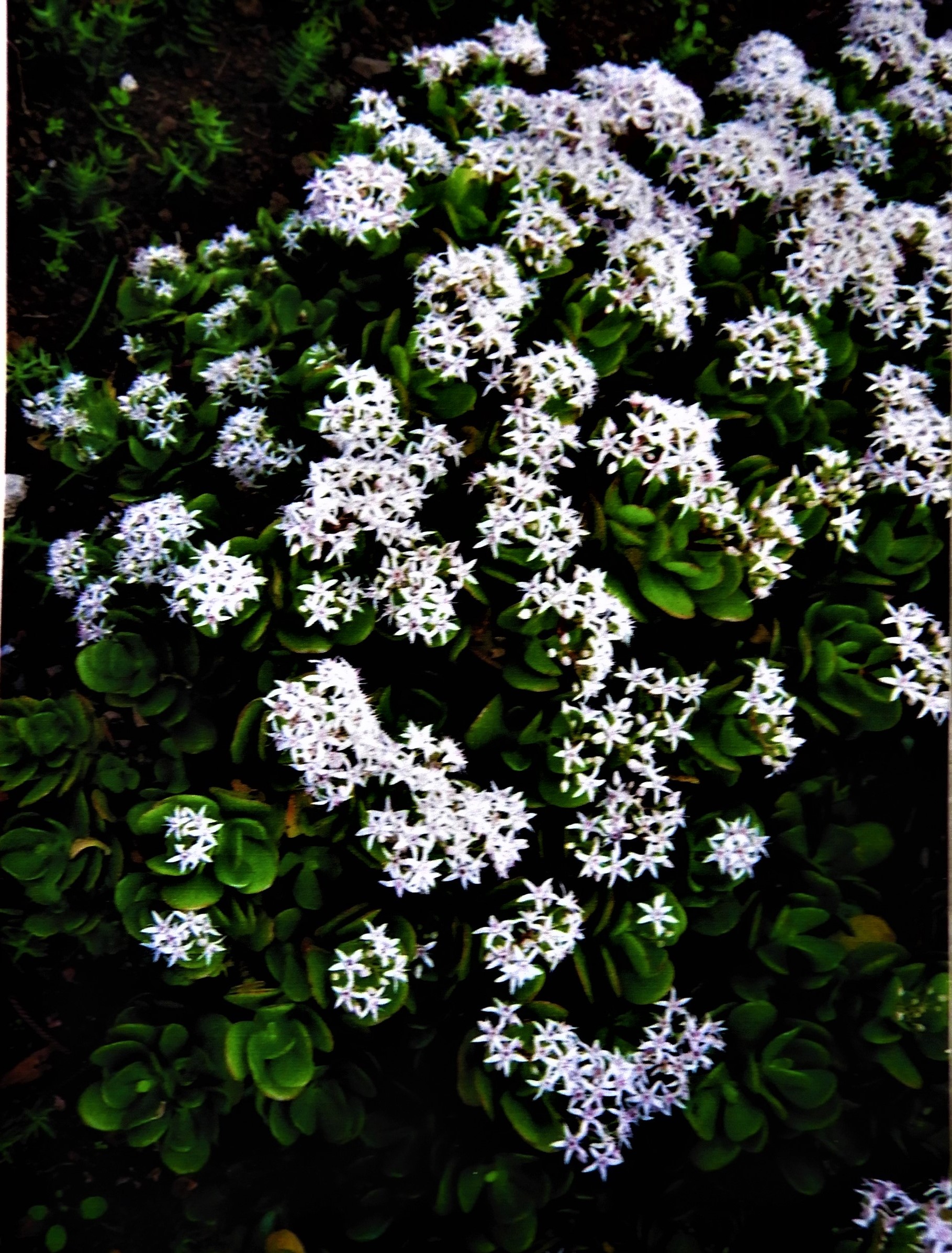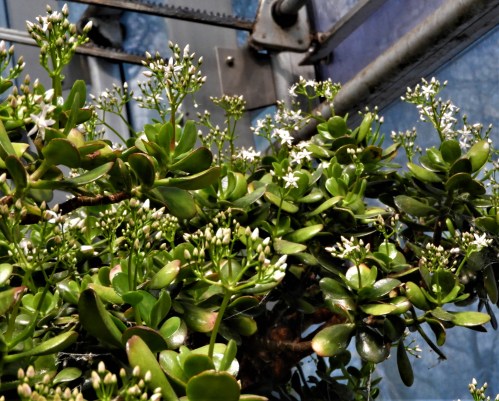 Det var egentligen hit jag siktade, till E.Anderssons växthus. Livsträdet, Crassulan hade blomknoppar för ett par veckor sedan och jag hoppades att det nu skulle slagit ut.  Så här kan den se ut när den blommar på Madeira  (2007) och nästan lika fin har jag sett den hos Andersson något år, ett stjärnregn. På fb finns det just nu många som beklagar sig över att de inte får den att blomma i sina fönster, medan en del lyckas. Jag frågade en gång den då levande professorn Stig Blixt i Landskrona, växtgenetiker hur  man skulle sköta den för att få den i blom. Den är mycket strikt ljusberoende och oftast får den för lite ljus hos oss och han sa antalet timmar den måste ha ( tror det var 6) på vintern för att blomma och klarar man bara att belysa den rätt så blommar den. Men det räcker inte med vanlig lampa, det måste motsvara dagsljus.