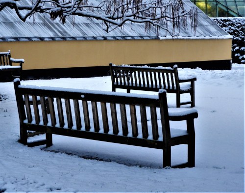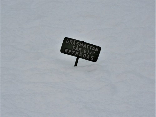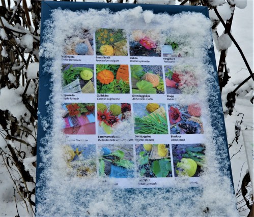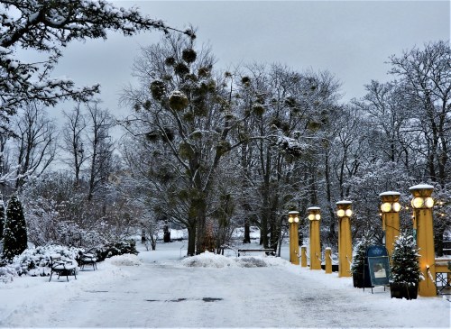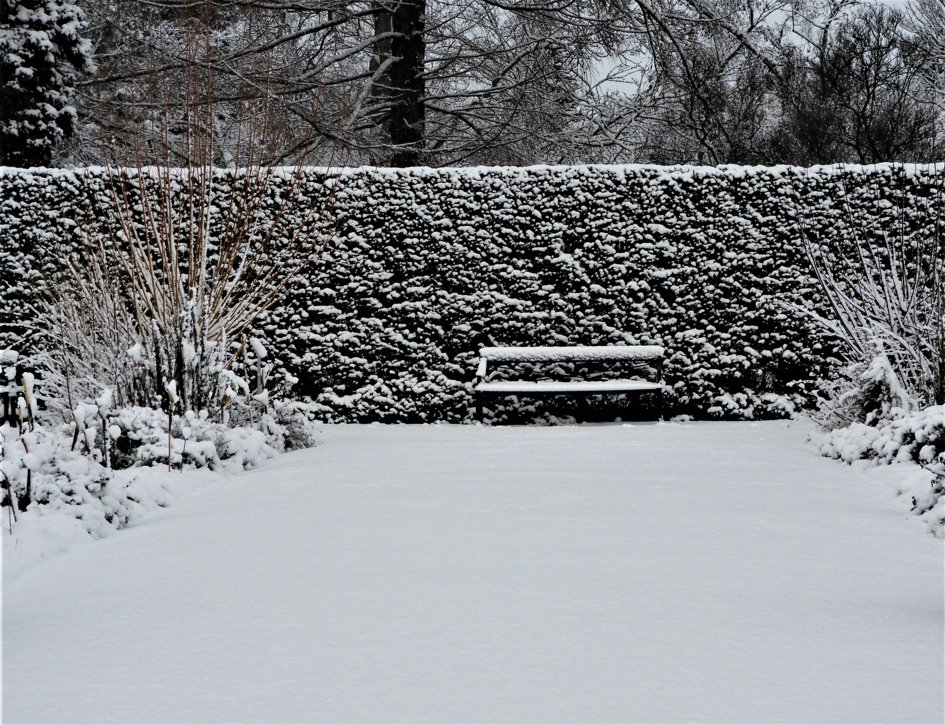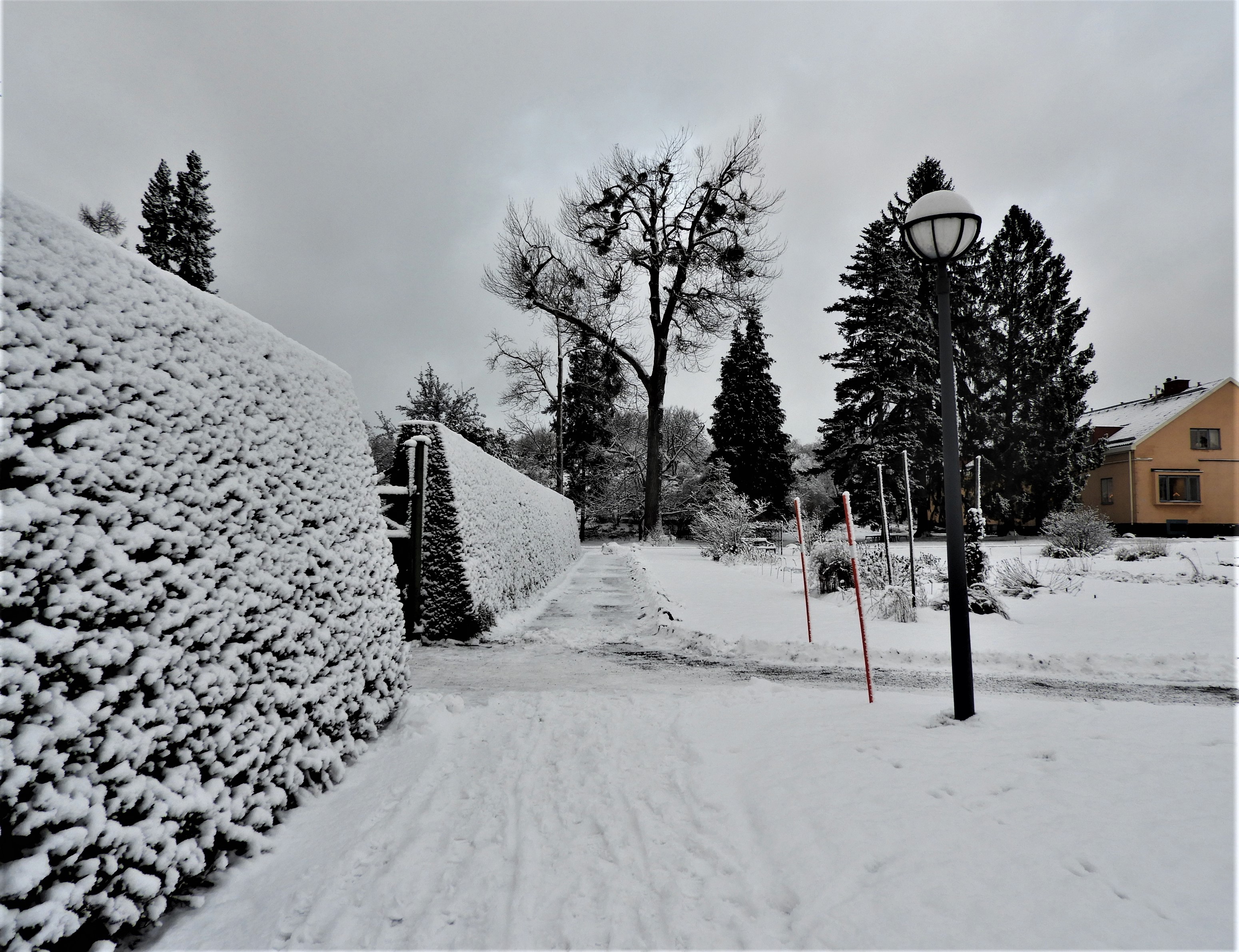 Den nya vita snön låg kvar på marken och träden och trädgården var en annan, den hade fått en osynlighetsmössa på och den i sin tur var utsökt vacker.  Granhäcken blev en vit vägg men mistlarna blev inte osynliga