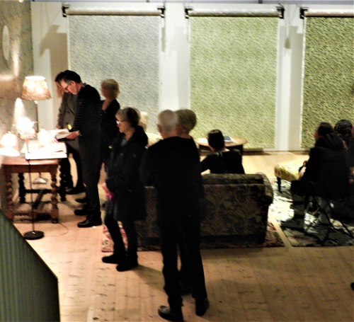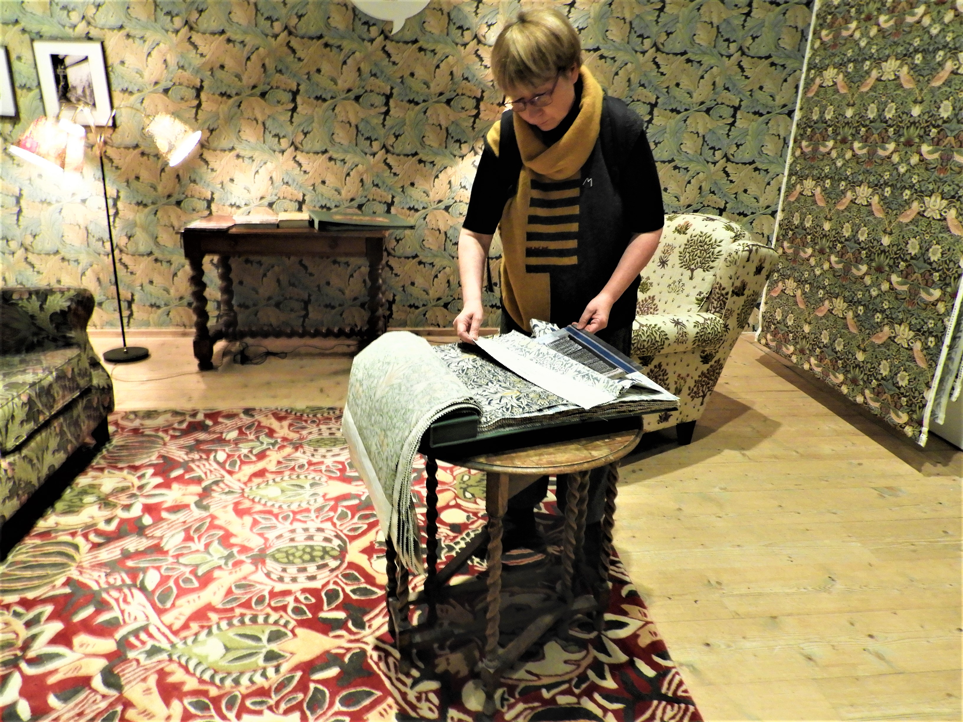 På Millesgården har en utställning om William Morris annonserats sedan någon gång i höstas. Inte förrän nu har jag tagit mig dit för att lära mig något mer om mannen bakom de mustiga tapetmönstren. Det låter ambitiöst men egentligen for jag dit för att se om de hade något vackert mönstrat tyg som jag kunde skicka till Selina på hennes födelsedag på torsdag. Jag valde den röda färgställningen av smultrontjuven. Här kan man sitta i Morrismönstrade möbler och se tapetvåderna rulla fram i ett evigt kretslopp och även bläddra i provböcker