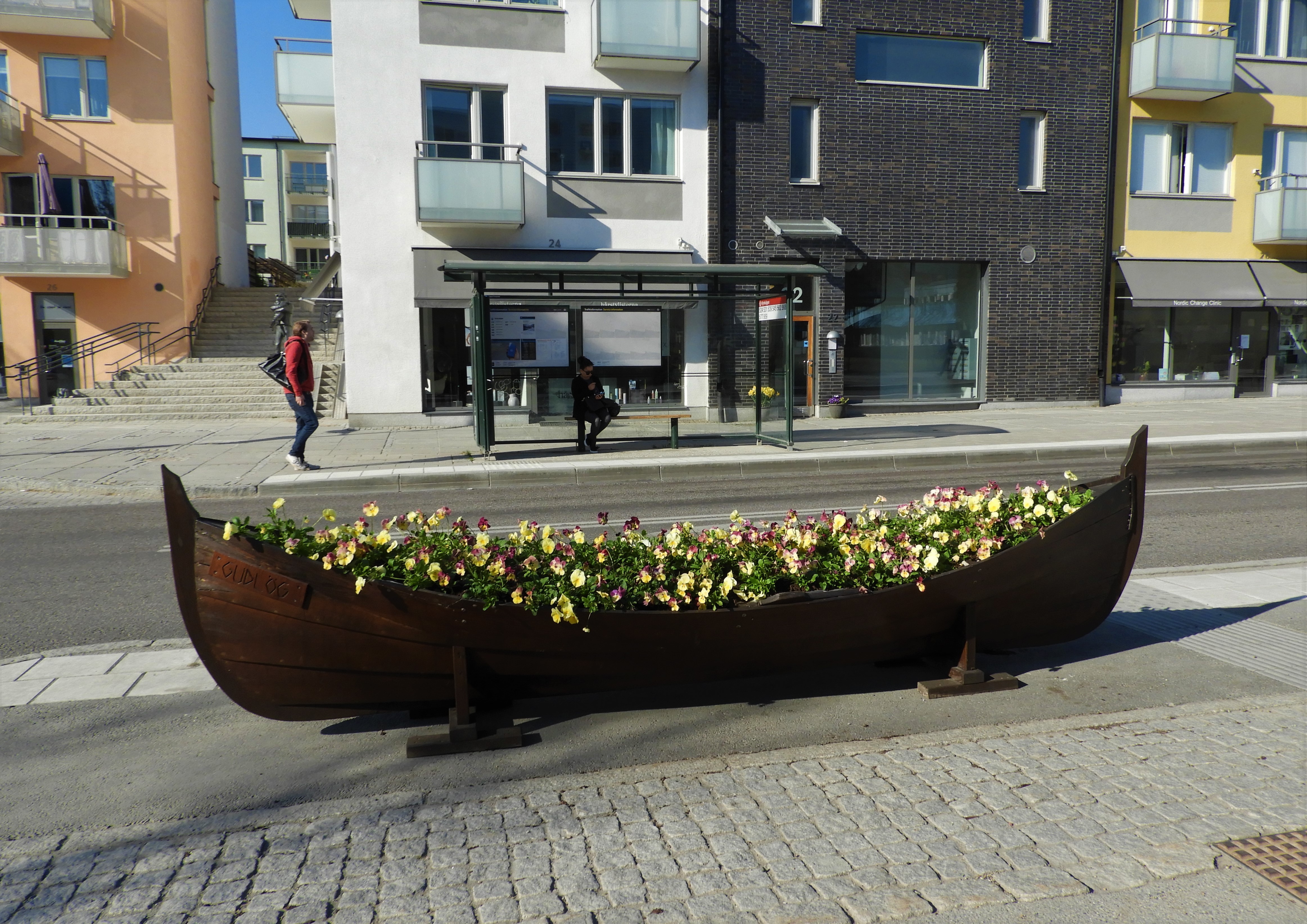 Stärkt av gårdagens promenad utmed huset, gick jag idag lite längre, rustade mig med Lasses gamla rollator, som fått vila i klädkammaren för just det här tillfället och rundade Centrum på utsidan. Nyplanterade roddbåtar med penséer i rosa och gult, allt fortfarande med mycket färg.