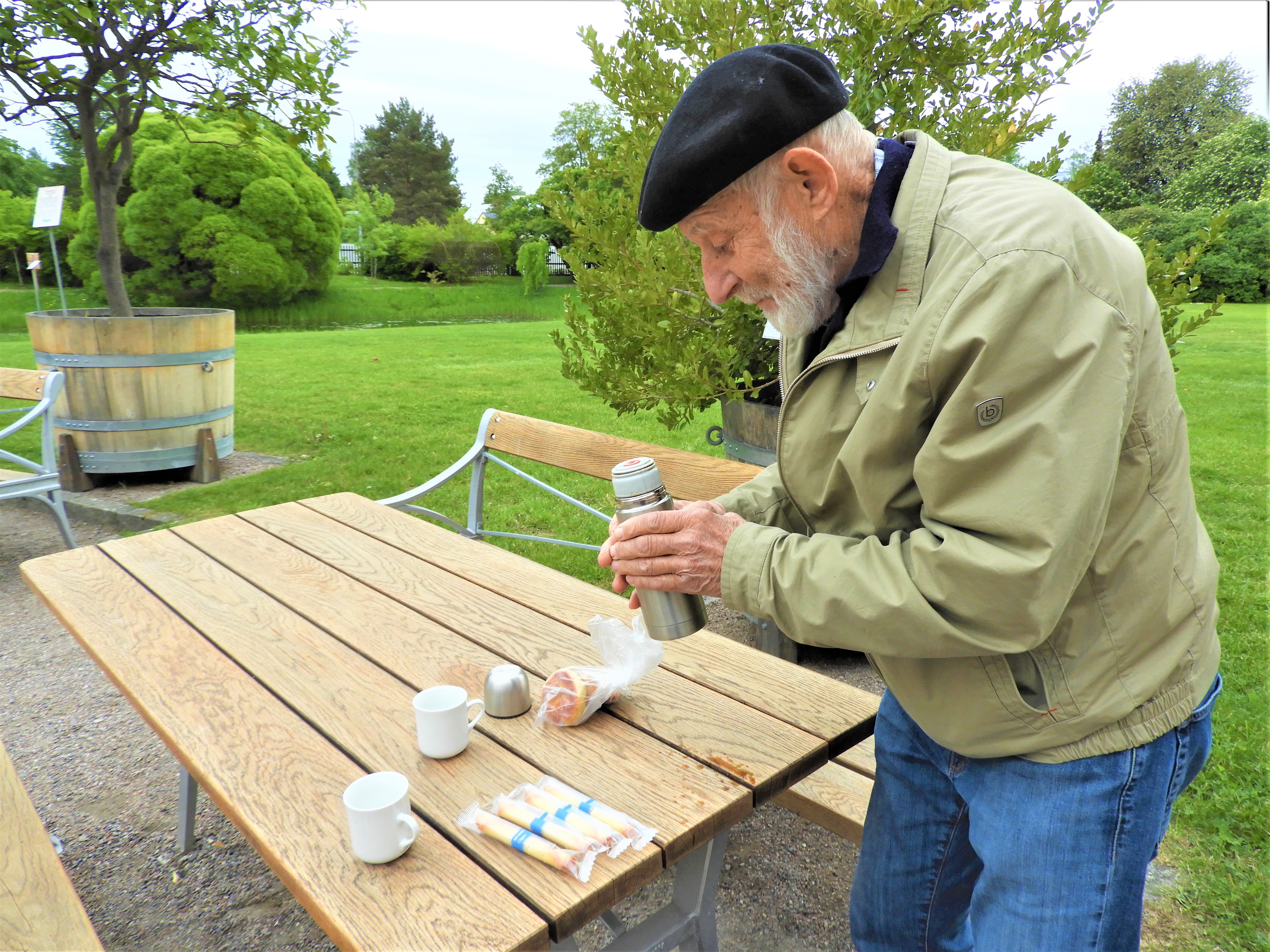 Tollef hade siktat på en visning men det började regna och visningen blev inte av, då kan det kanske sitta bra med lite kaffe och bulle. Regnet tilltog och vi hastade vidare till tropiska växthuset, där kan vi i alla fall gå in.