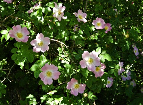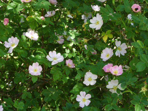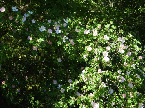 För mig är det törnrosens dag, mer än så här kan de nog inte vara utslagna alla på en gång. Åkerholmarna är tillslutna med en häck av de taggiga buskarna och blommorna varierar i färg från vitt till mörkrosa. Vi bor i Carl Jonas Love Almqvists landskap (ett av dem) och jag letar efter citat om törnrosen som han hade en särskild känsla för men hittar bara en vers om hjärtats ros som jag inte riktigt förstår.