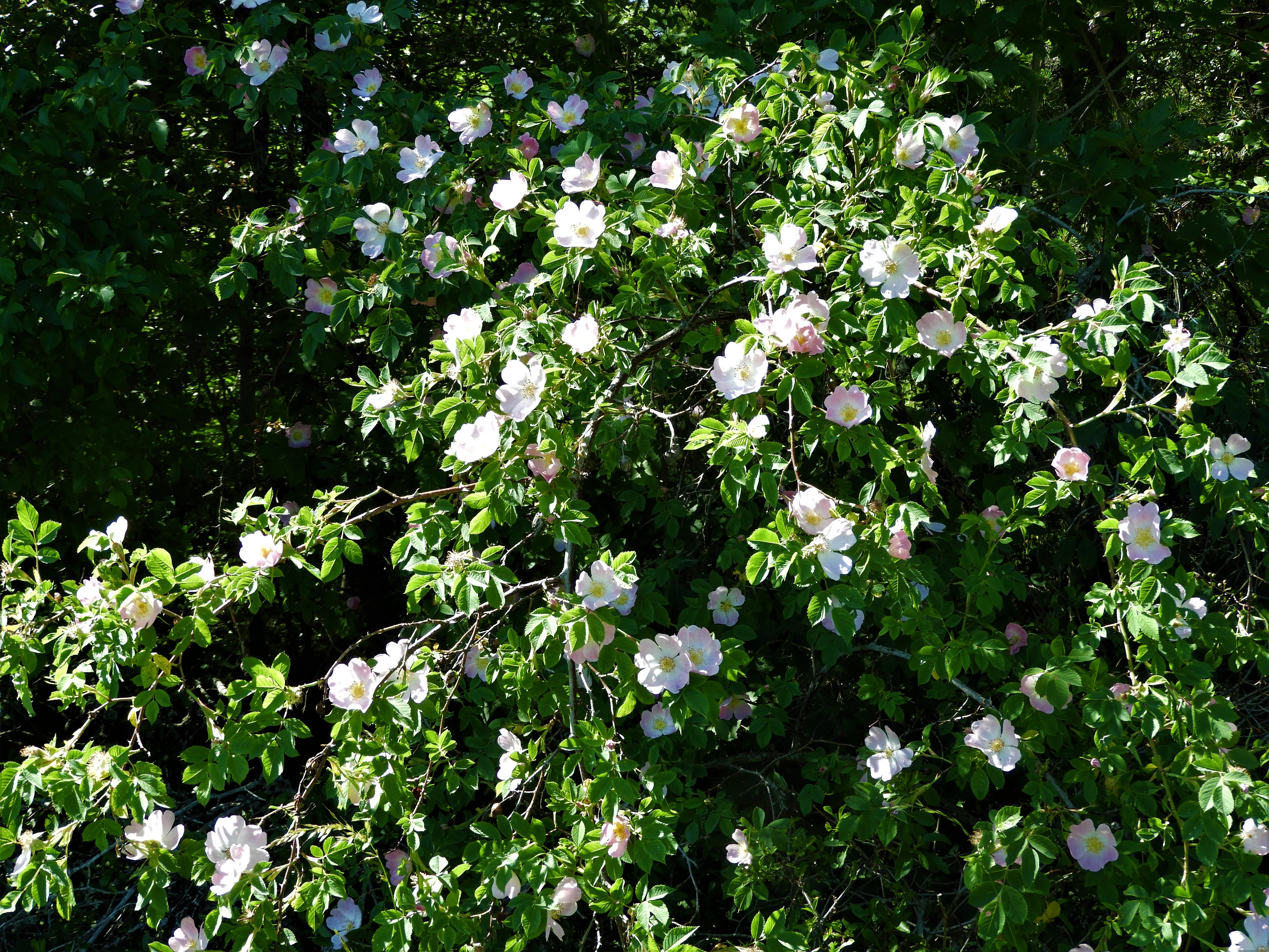 För mig är det törnrosens dag, mer än så här kan de nog inte vara utslagna alla på en gång. Åkerholmarna är tillslutna med en häck av de taggiga buskarna och blommorna varierar i färg från vitt till mörkrosa. Vi bor i Carl Jonas Love Almqvists landskap (ett av dem) och jag letar efter citat om törnrosen som han hade en särskild känsla för men hittar bara en vers om hjärtats ros som jag inte riktigt förstår.