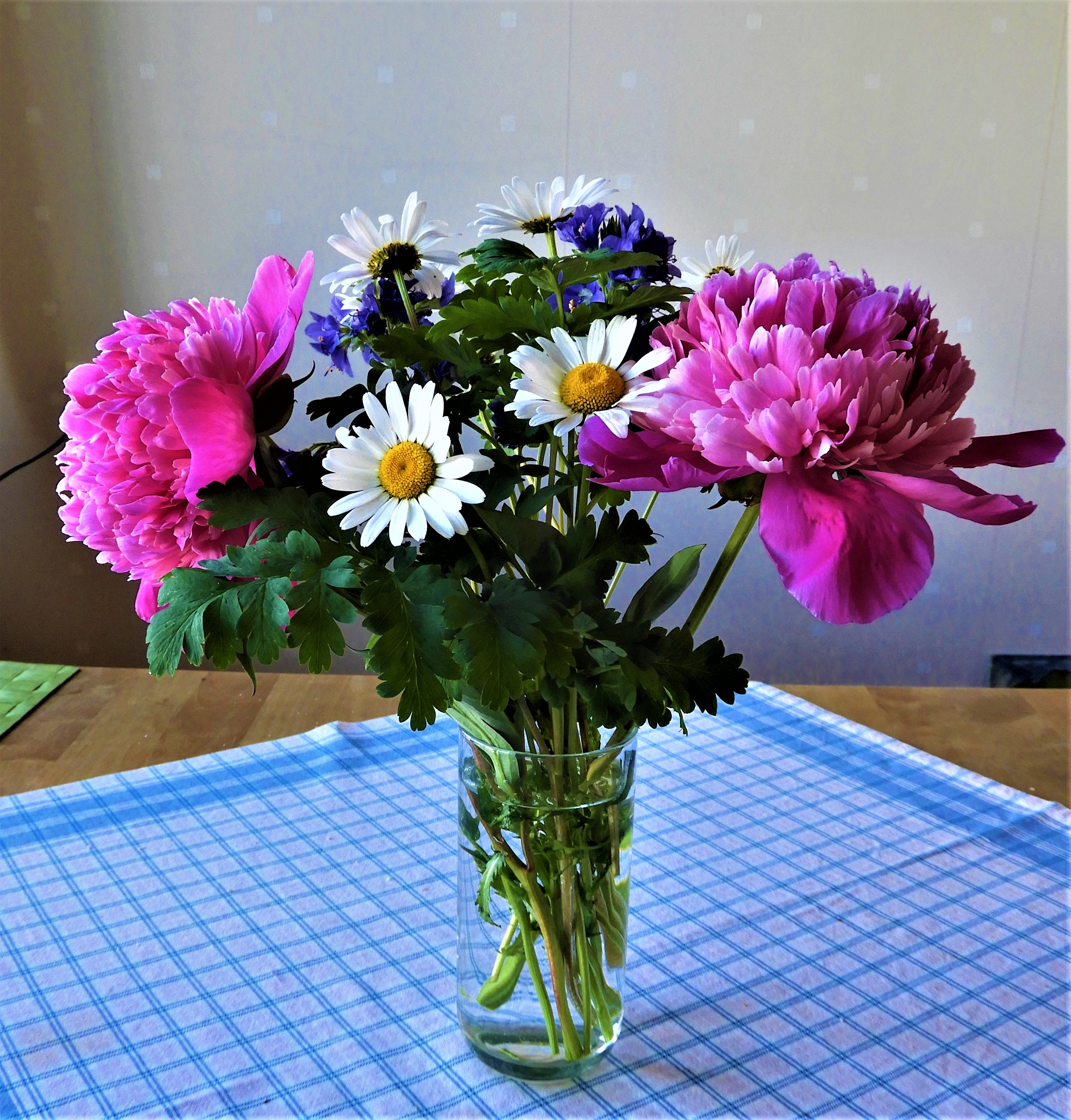 Då jag kom hem igår, ringde grannen på dörren med en doftande hälsning från sommarhuset i Törndal. Två pioner fyllde hela lägenheten med väldoft.