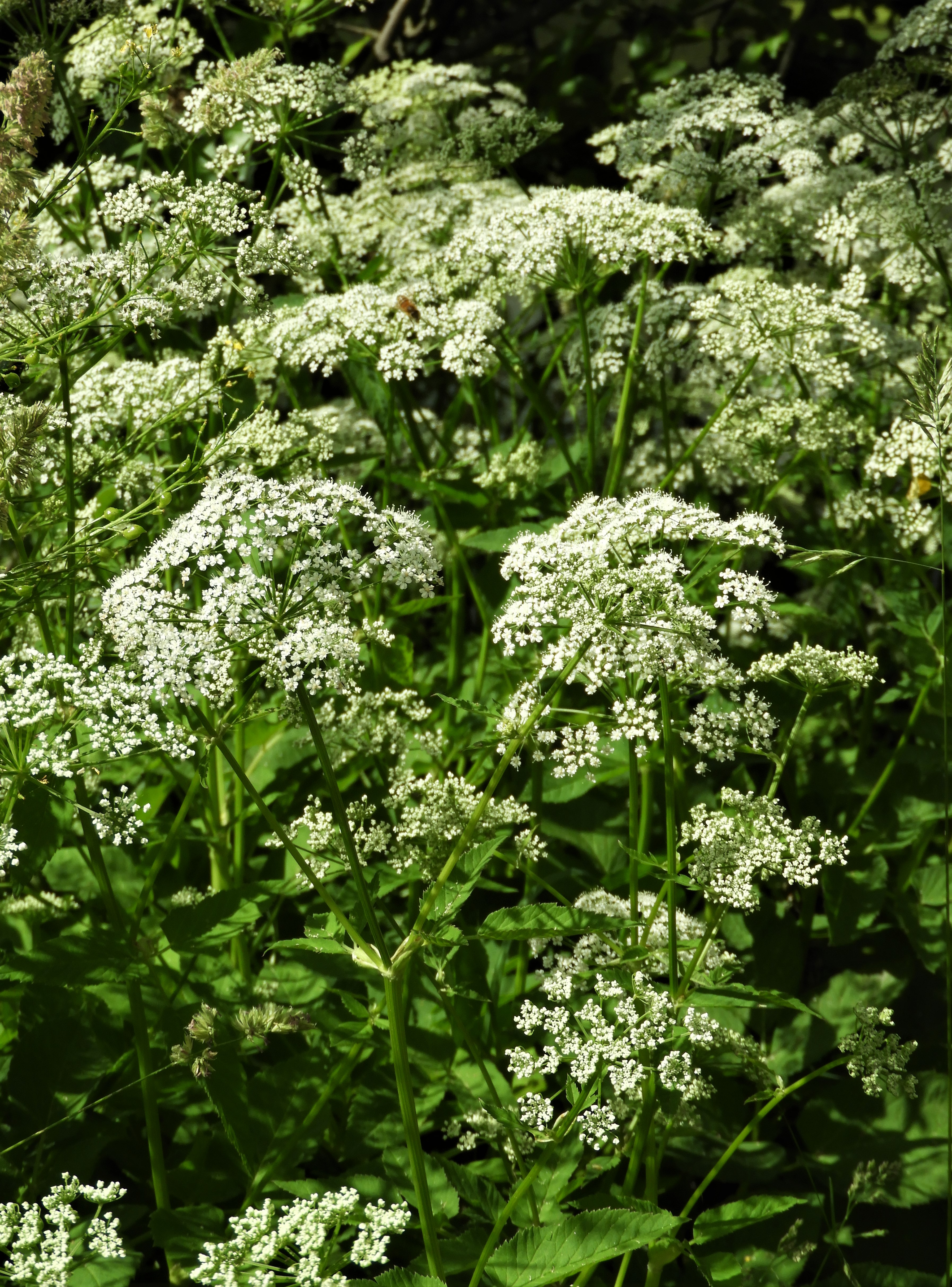 Kirskål i blom, kommun-gräsklipparen har till och med sparat flera fält med blommande kirskål utmed ån, de är som en böljande vit-grön spetsduk.