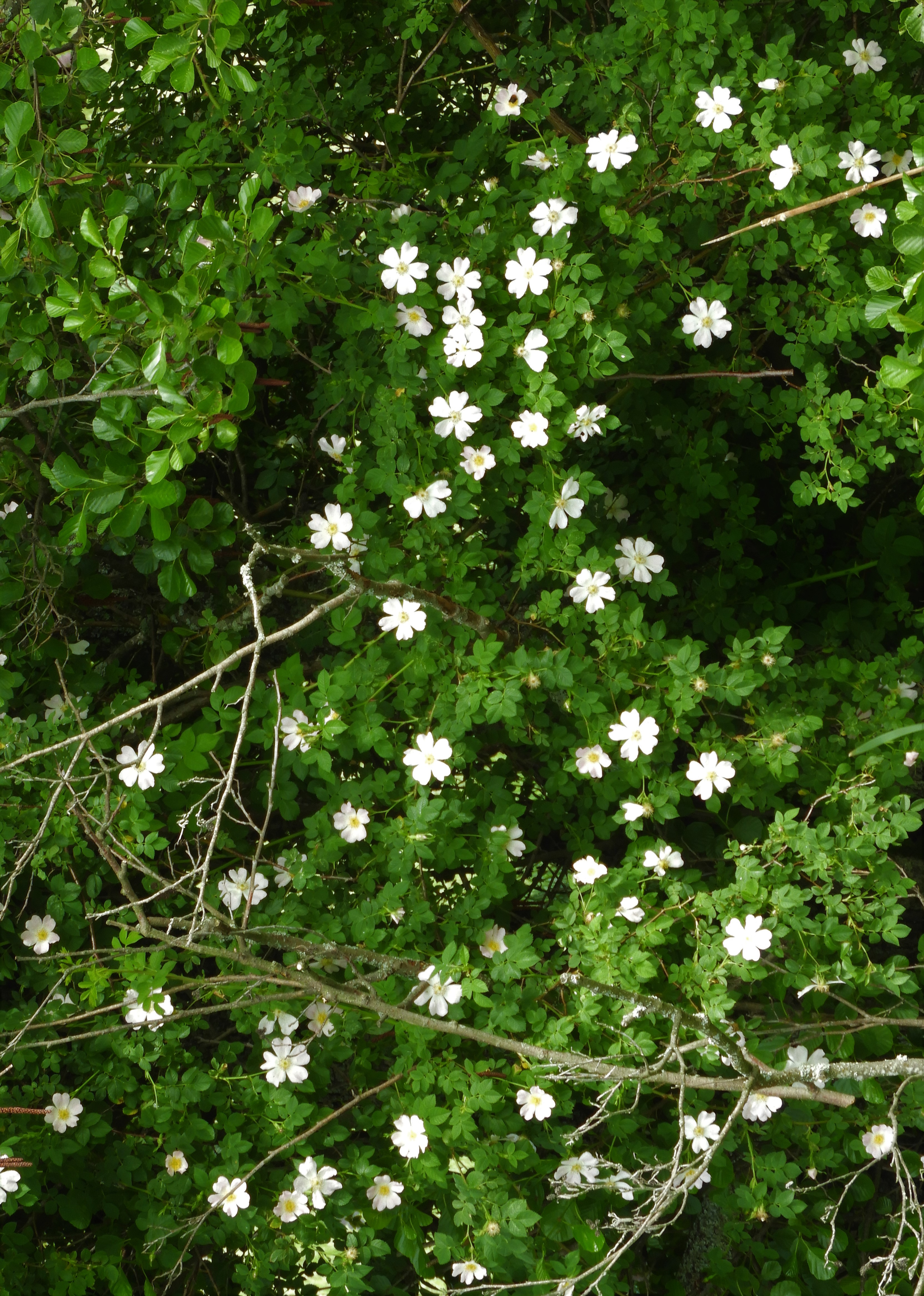 Törnrosor klättrar högt i träden utmed ån och blommar lika fint som de i går.
