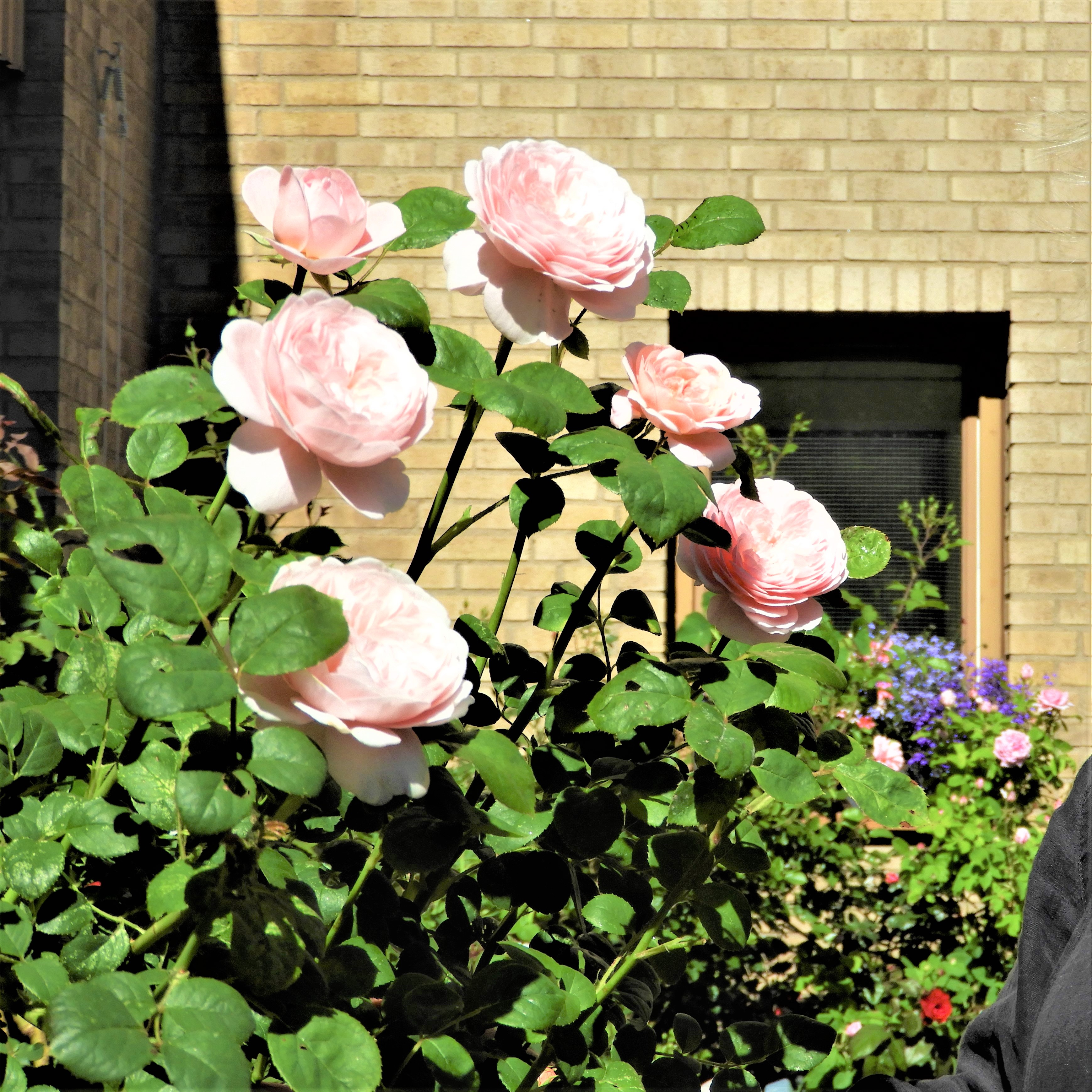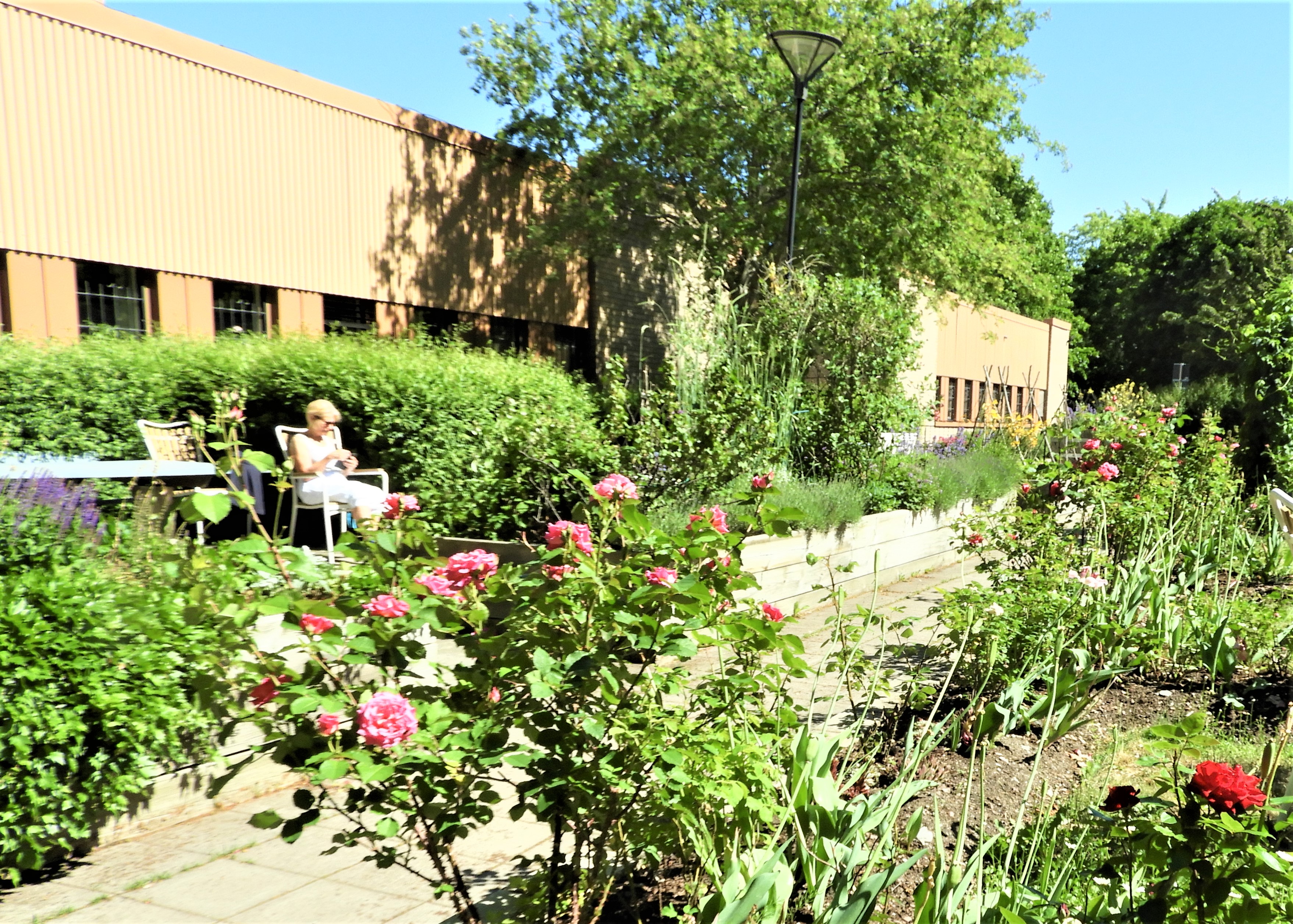 På innergården reser sig rosor högt utmed väggarna, de hör till den ursprungliga planteringen och flera buskar från anläggningstiden har fått kraftiga stammar. Vintern for hårt fram med en pergola som funnits med från början. Den var helt klädd med vin som gav kilovis med druvor men den rasade och när den avlägsnats uppstod ett tomrum.