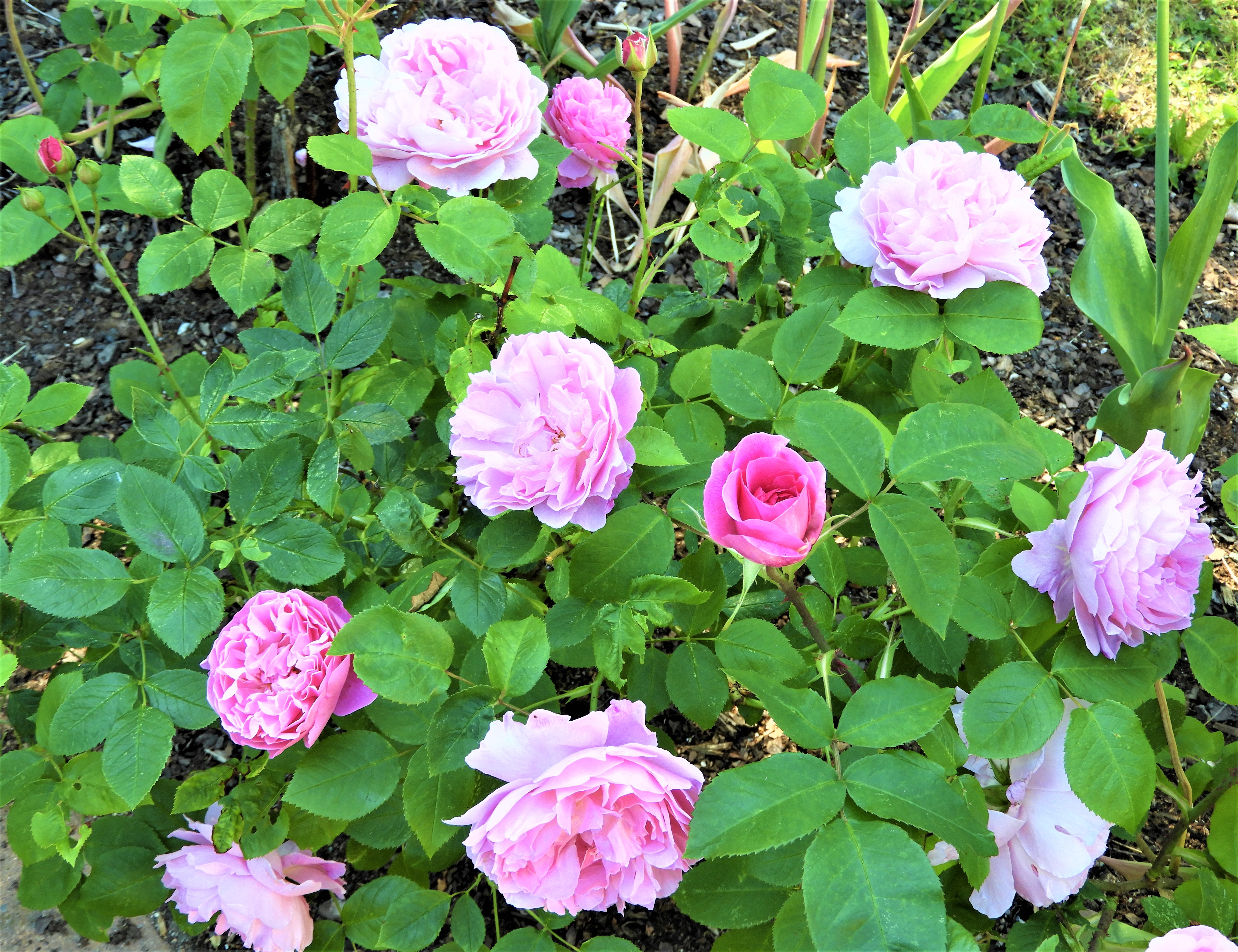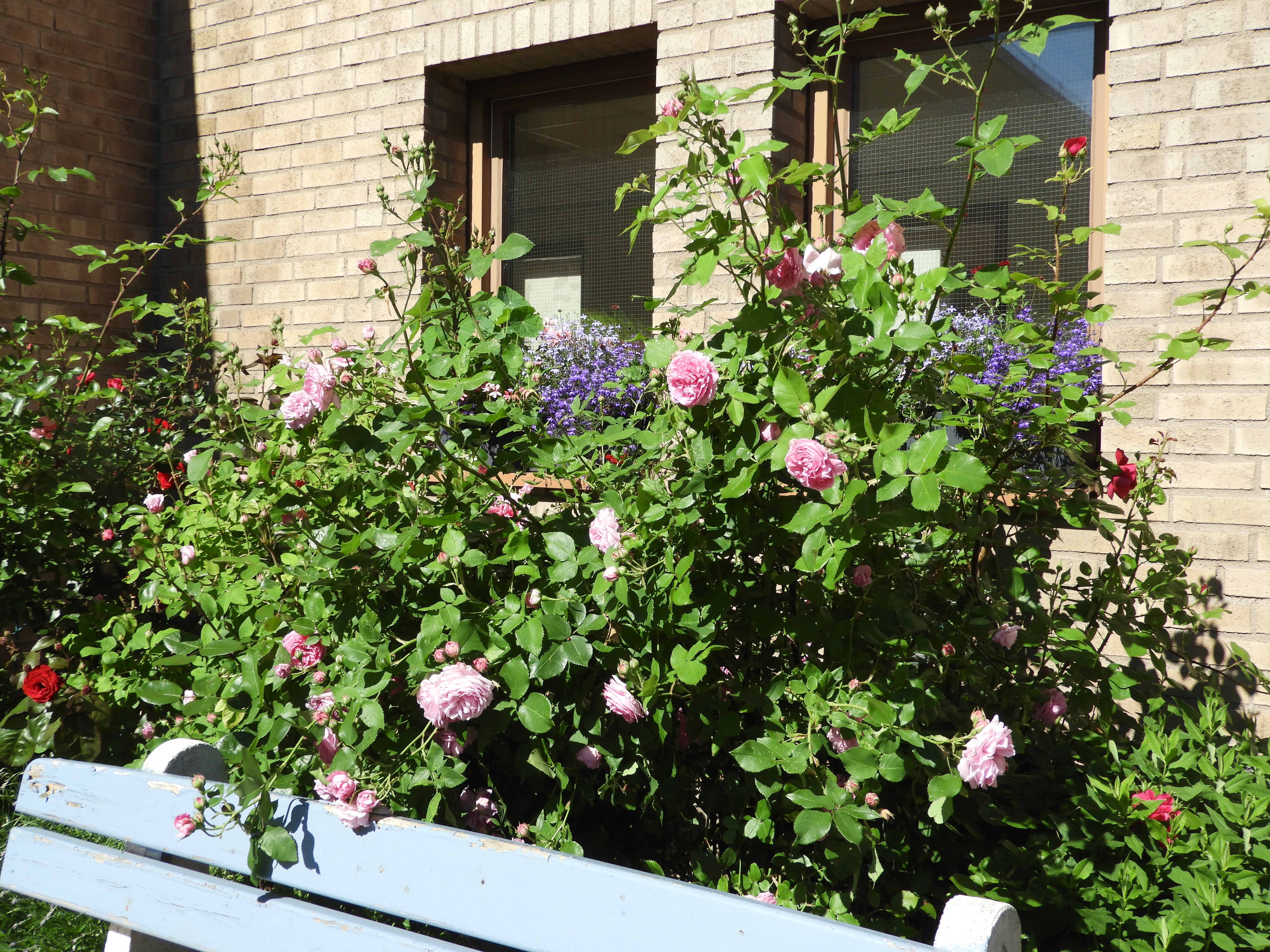 Den yttre trädgården med alla storblommiga rosor från 90-talet. De första att slå ut är ljusrosa och namnet ännu en gissning.