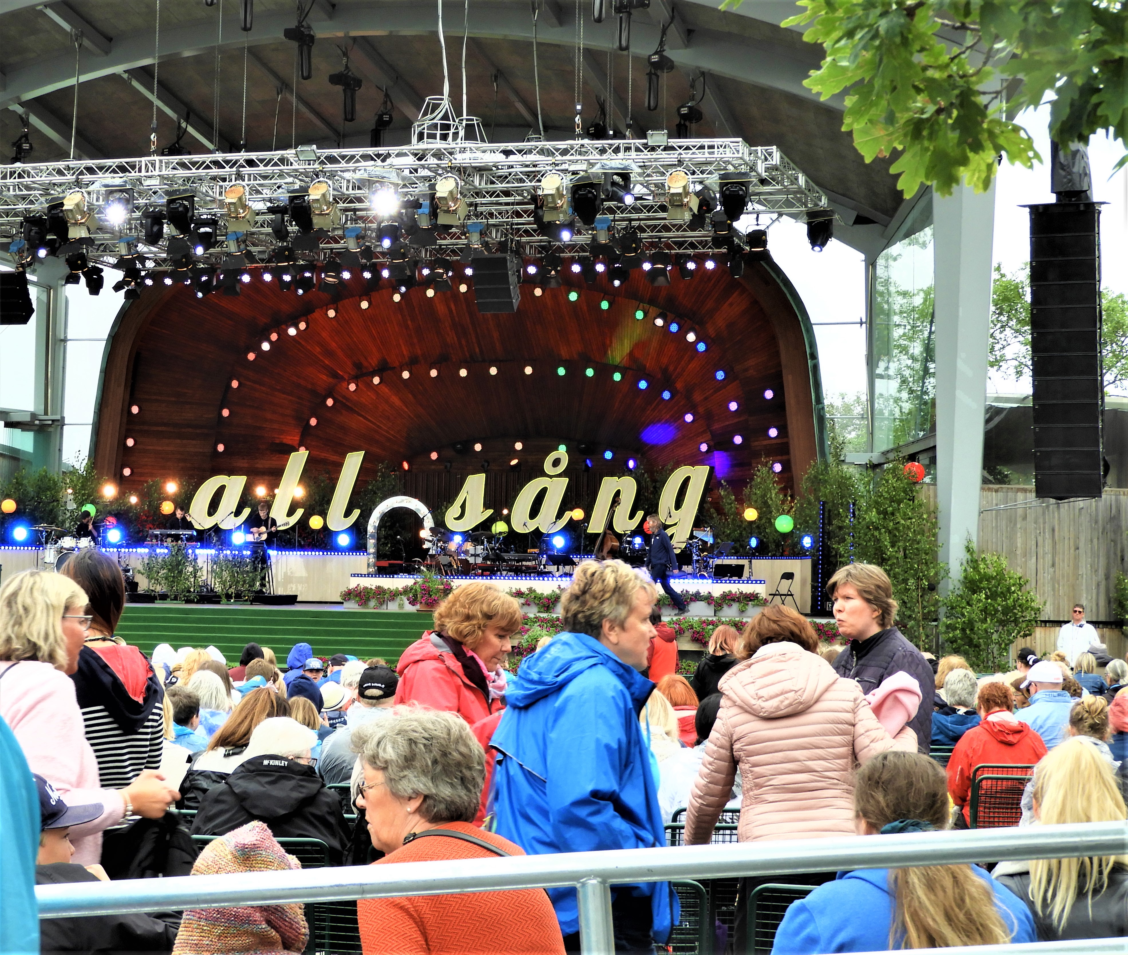 Selina som håller reda på vad som sker hade sett att det var Allsångsdag idag och Arvingarna skulle uppträda. Jeanna, som varit Selinas kompis ända sedan dagis har sommarjobb på Skansen och idag skulle hon vara vid entrén till Sollidens sittplatser. Vi letade upp Jeanna, repetitioner pågick på scenen och man övade sångtexter med publiken som suttit där sedan tidiga morgonen och som inväntade kvällens föreställning, musiken dånade till ibland så marken skakade och ännu mer folk strömmade till, hur ska alla få plats?