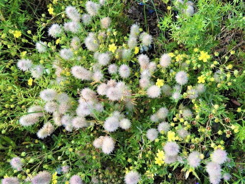 I gruset utmed vägen blommar harklöver (Trifólium arvénse) och
