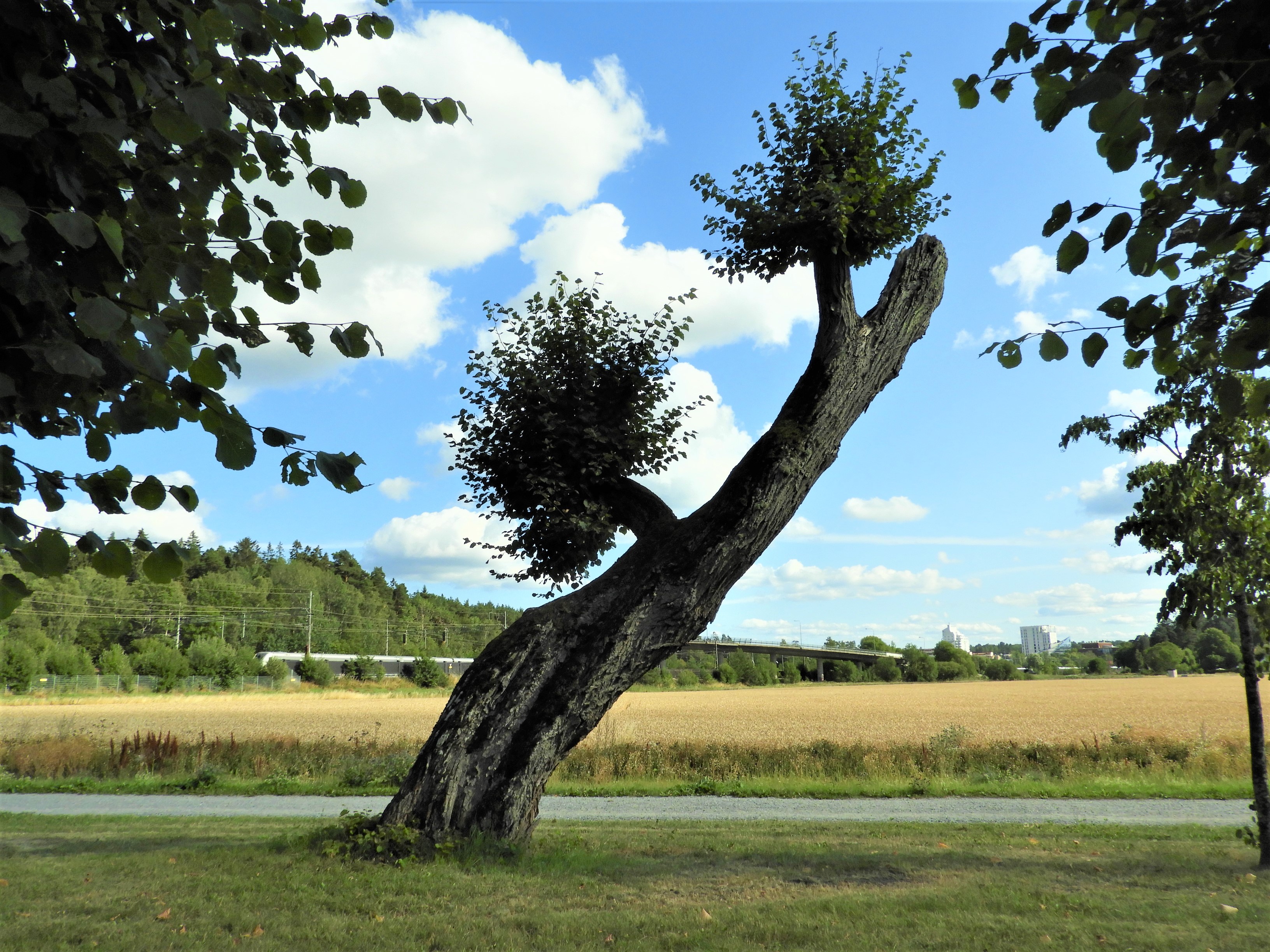 En gammaldags sommardag med sol och lite blåst och bara ett par grader över tjugo, i dag måste jag gå ut och se vad som blommar. Minst komplicerat blir det om jag ställer bilen vid rensdammarna och siktar på Barockparken. Vägen dit går utmed järnvägen där marken har blivit både omrörd och påfylld med grus från andra platser, här växer allt möjligt som klarar att gro och växa i grus. På vägens andra sida är ett stort fält där man i år odlar vete i den tunga leran och längs åkern går ett djupt dike där växter som gillar att stå i vatten, hittat en boplats. Just nu blommar rosendunört i hela dikets längd men jag kommer inte åt den.
