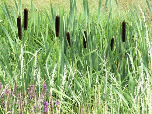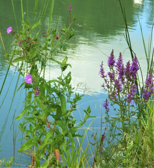 Dammarnas vatten är grågrönt , runt kanterna blommar rosendunört (Epilobium hirsutum) och fackelblomster (Lythrum salicaria).