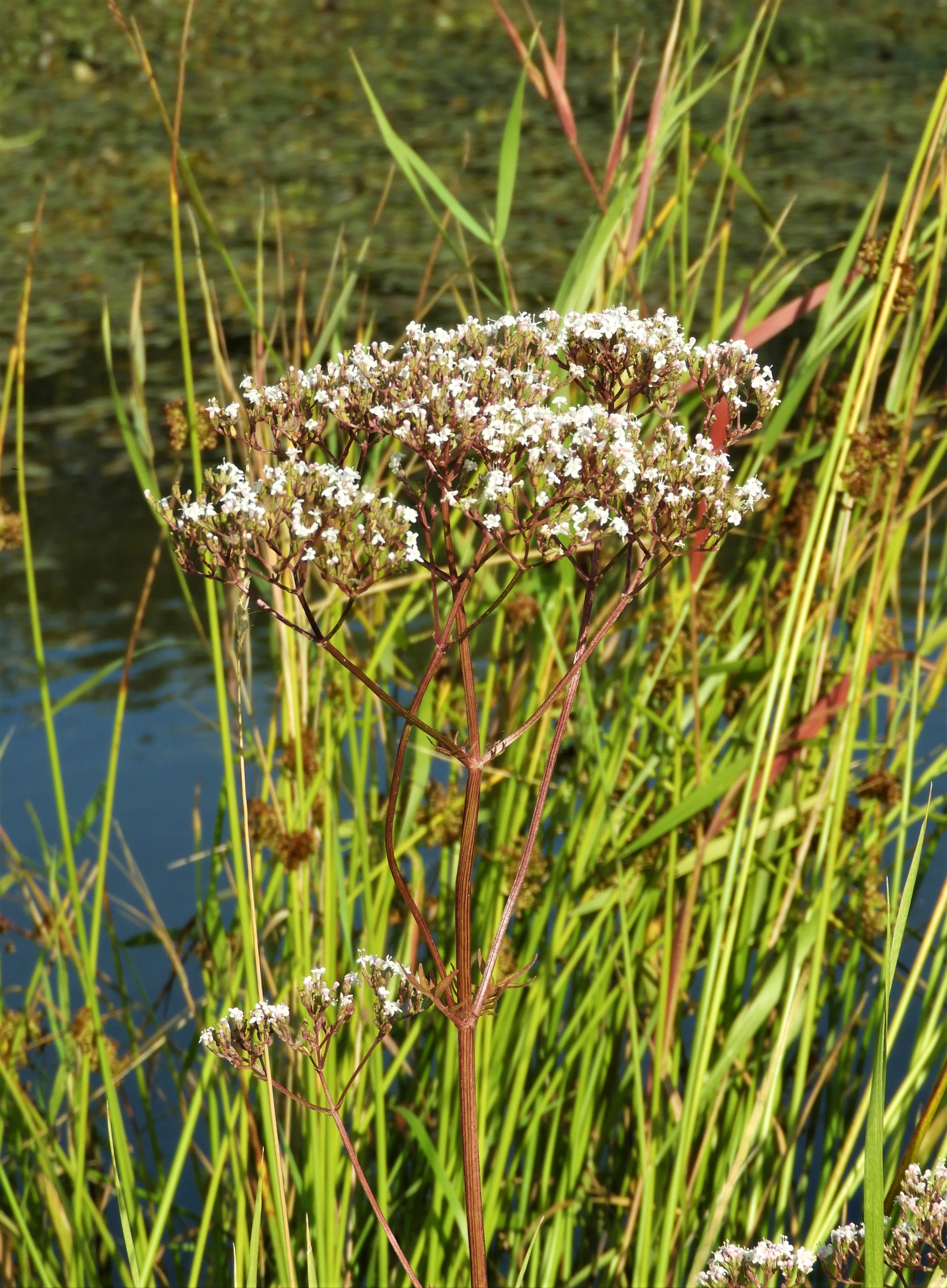 Jag ät tillbaka vid rensdammarna, en sothöna med två halvvuxna ungar simmar bland vattenväxterna, det är få öppna vattenytor att röra sig på. Här blommar vänderoten (Valeriana officinalis) som numera heter Valeriana sambucifolia dvs med blad som liknar fläder. Jag hoppas på det gamla namnet som säger att den använts som medicin. Såg reklam på TV för ett receptfritt sömnmedel som innehöll valeriana. Jag knipsar några blomställningar och sätter i vas hemma, så kanske jag sover lite bättre. Det enda tråkiga är vänderotens doft, fotsvett, som bara katterna gillar.