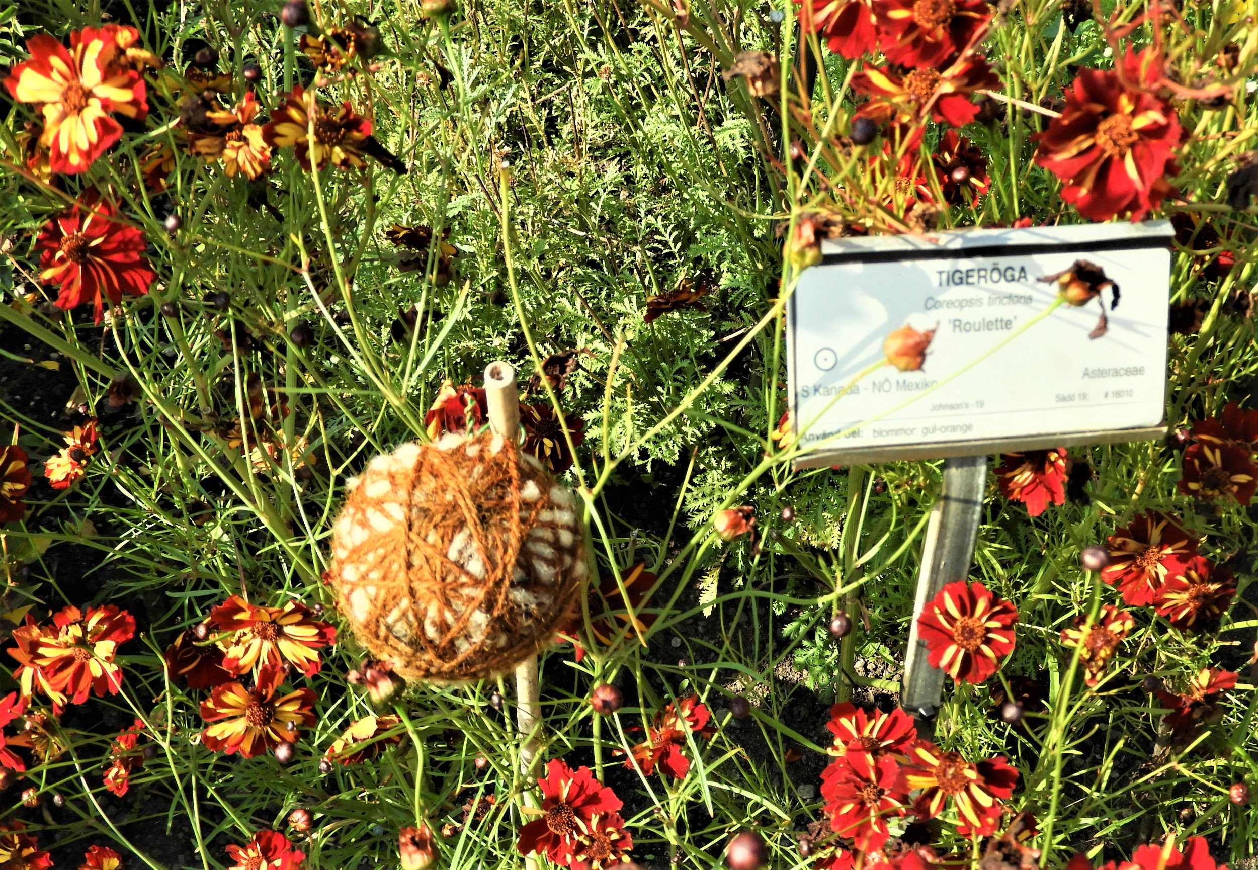 Utmed färgväxtgatan fanns påtagliga exempel på garn som färgats med respektive växt, här brunrött med Tigeröga (Coreopsis tinctoria).