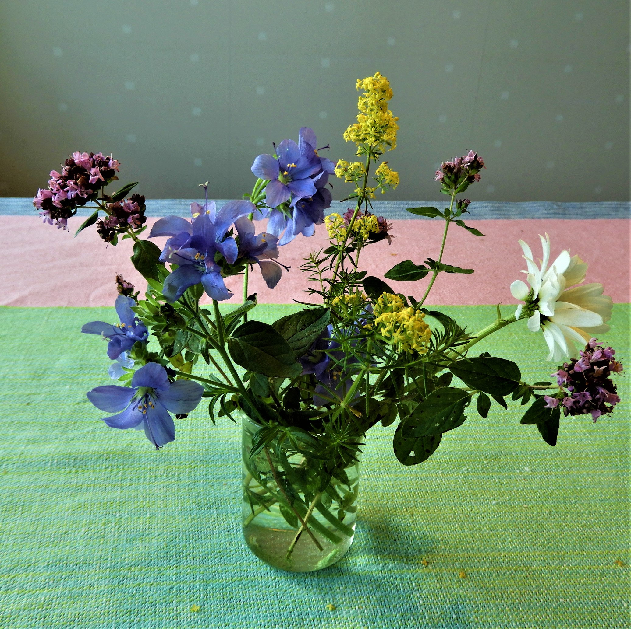 Det är några dagar kvar till Brittsommar men Uno och Margareta hade plockat de här blommorna vid sitt sommarhus i lördags, kungsmynta, Jakobs stege, gulmåra och prästkrage. Doften av gulmåra fyllde hela köket när jag kom hem från Karin igår.
