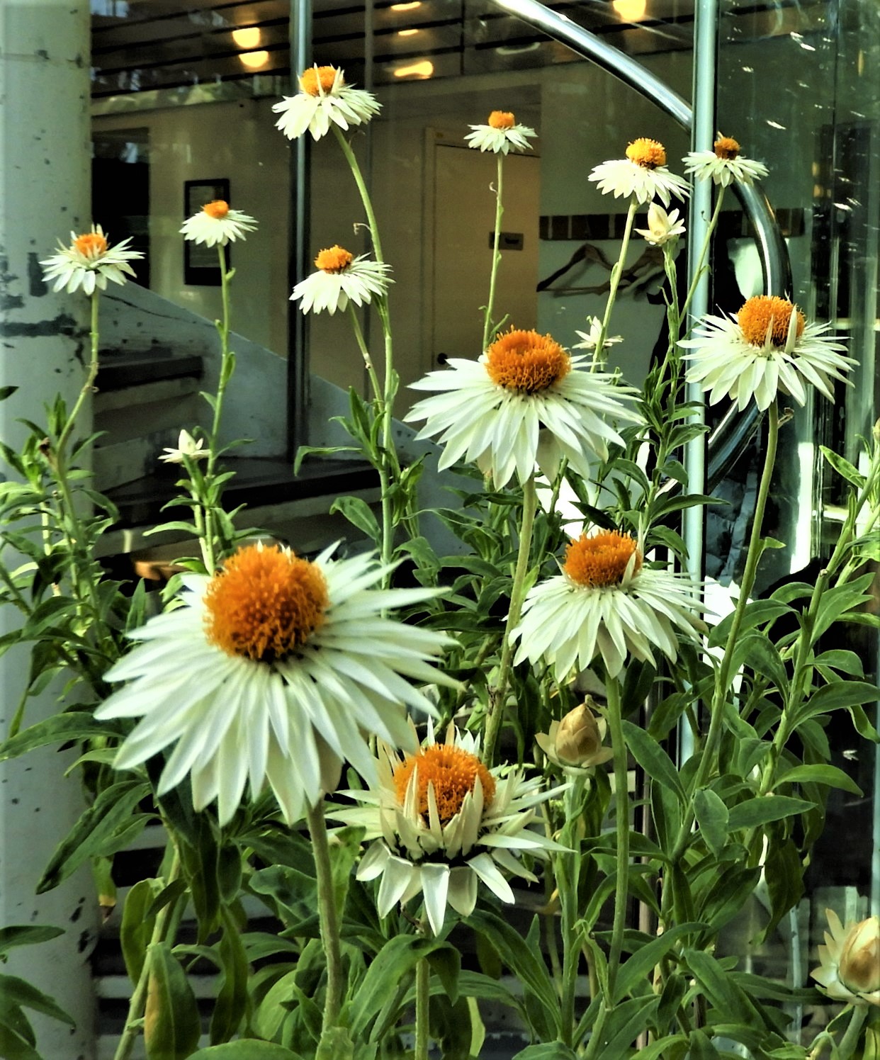 Det blåste alldeles hemskt ute och det var skönt att gå in till den eviga Medelhavsgrönskan. Symboliska blommor för dagens möte – eterneller.