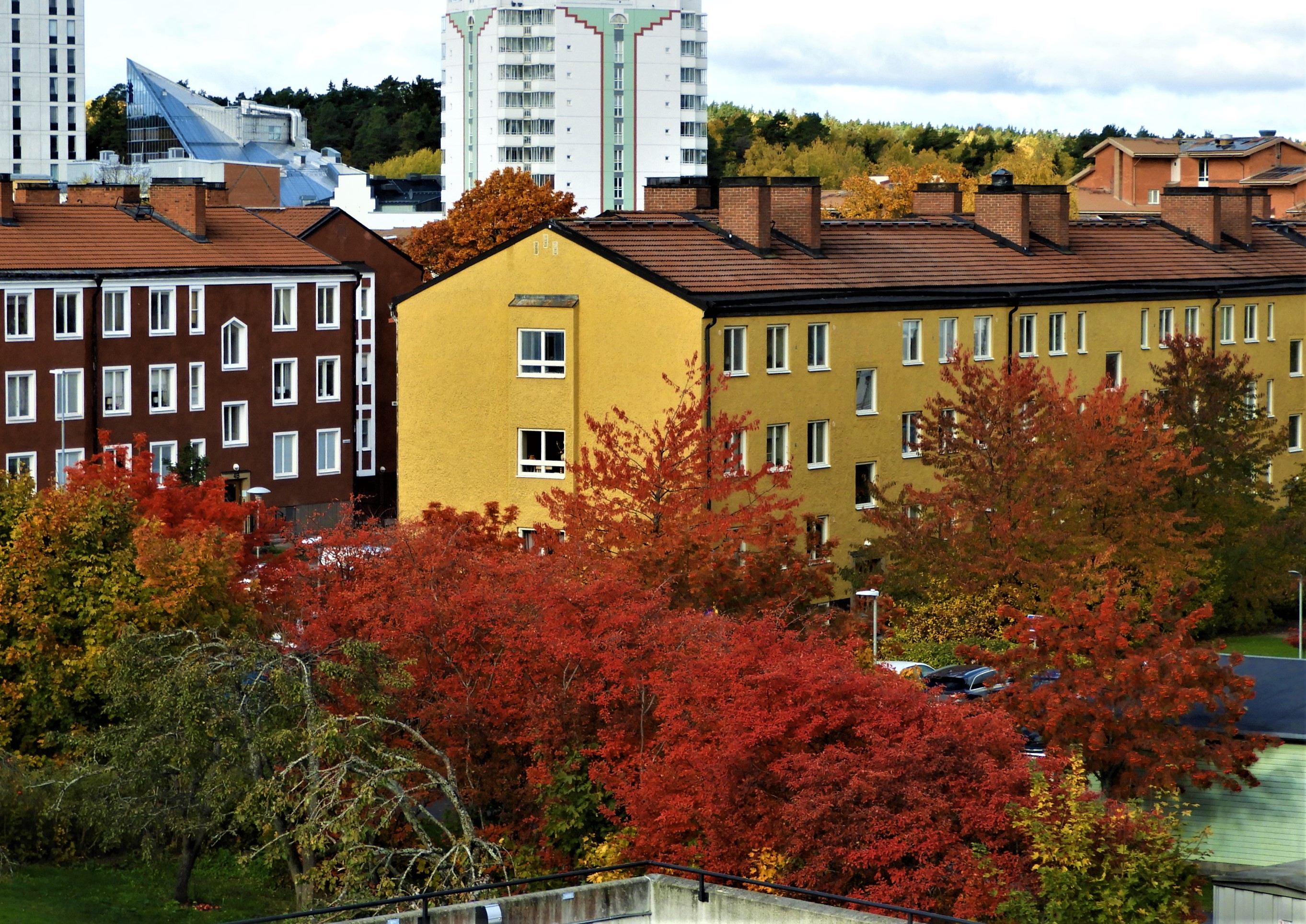 Från kökssidan ser jag ett vård-och omsorgshus och Väsby Centrum från utsidan. De har egna ingångar och mellan dem finns en infart för leverans av varor till alla affärerna i köpcentret. Några lönnar har blivit kvar mellan gatan och ingångarna och med löv på, skymmer de sikten lite, utan löv ser man allt som händer kring den vitala platsen.