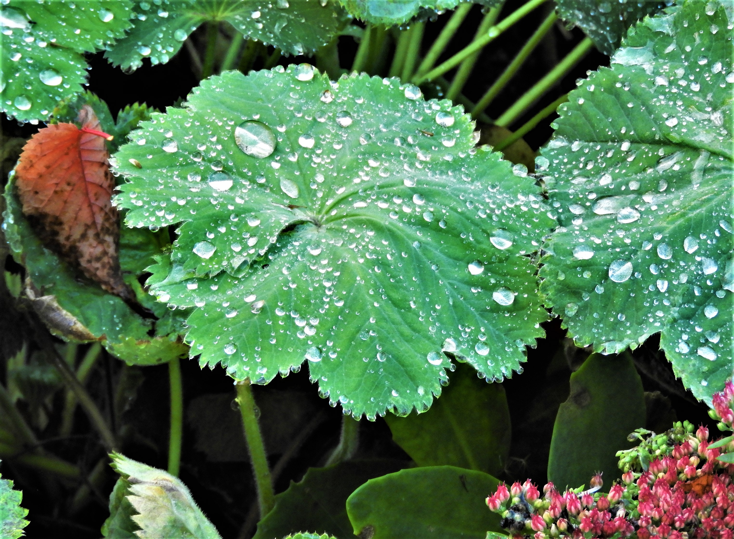 Jag går runt gräsmattan i parken, daggkåporna har dagg överallt utom  i bladtratten.