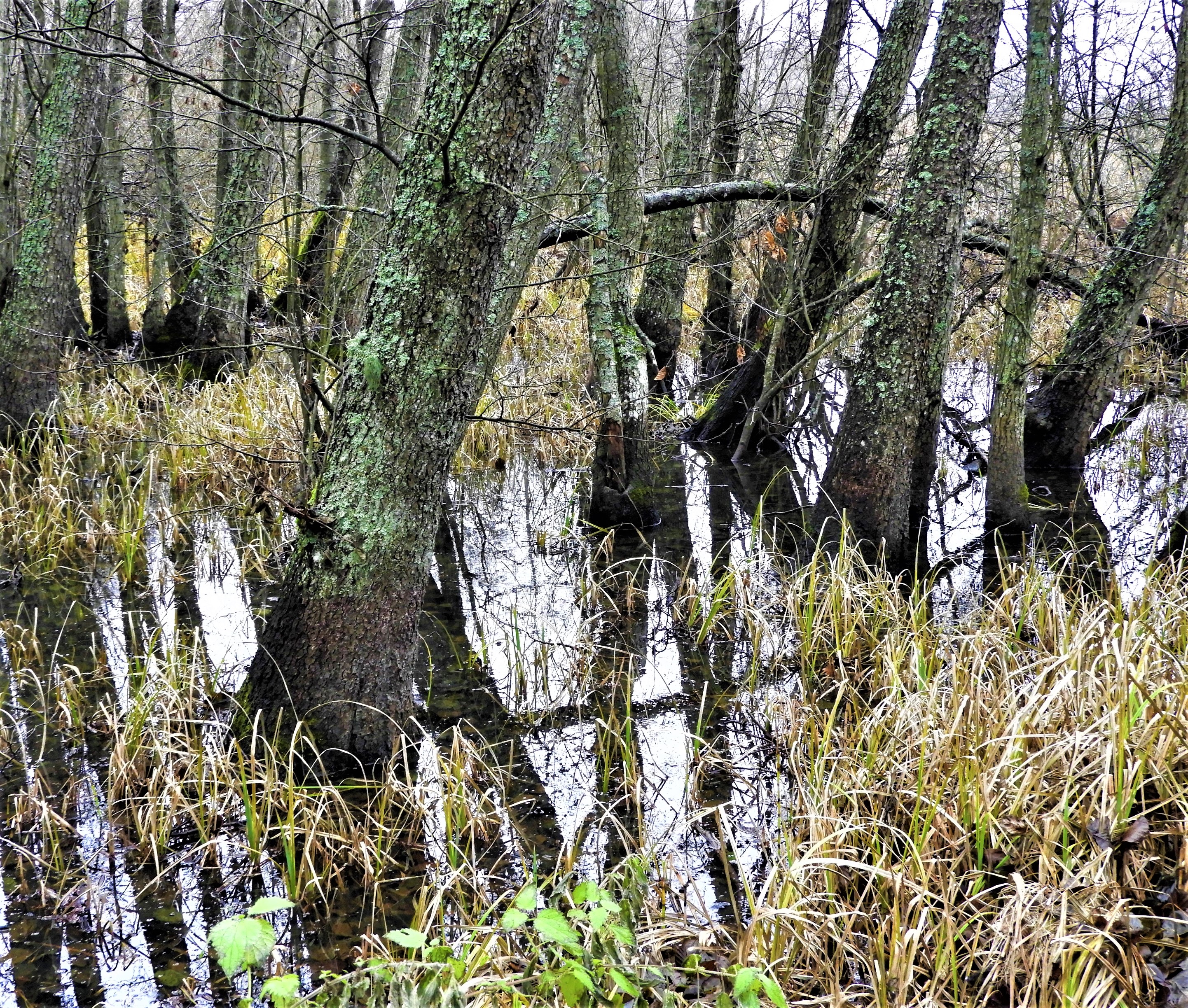 Den tar vi. Jag har redan förut undrat över vem som äger marken och som låter Kyrkvikens träd falla åt de håll de vill och gör en urskog av den vattenspeglande marken. Säg att det ligger en god tanke bakom och jag slutar att gnälla. Vi skyndar oss förbi flera murknade och starkt lutande träd för att inte hamna under om de skulle falla.