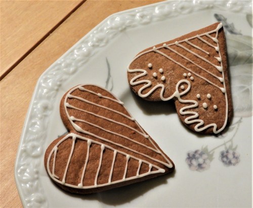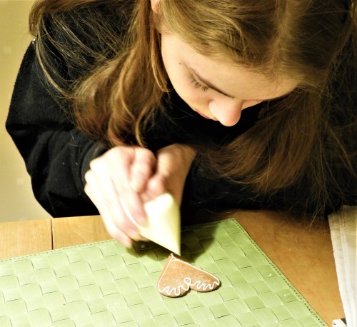 Alexandra frågade om det fanns någon pepparkaksdeg kvar. Javisst, det blir alltid en bit över som jag inte orkar kavla ut och den blir liggande till någon gång på nya året. En ganska hård bit lyckades hon mjuka upp och göra tunna kakor av och sen fixade hon glasyr och
