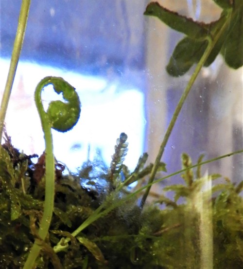 Den fina lilla buxbomen får komma ut om dagarna och se på utsikten. Nu har jag lärt mig för gott att ingenting som fryser i sin kruka överlever (här hos mig), rötterna måste ha åtminstone lite kontakt med ofrusen jord, det har de i rabatter men inte i krukor.En stensöta har börjat växa i en mossburk och rullar här ut sitt nya blad. Härligt när något växer !