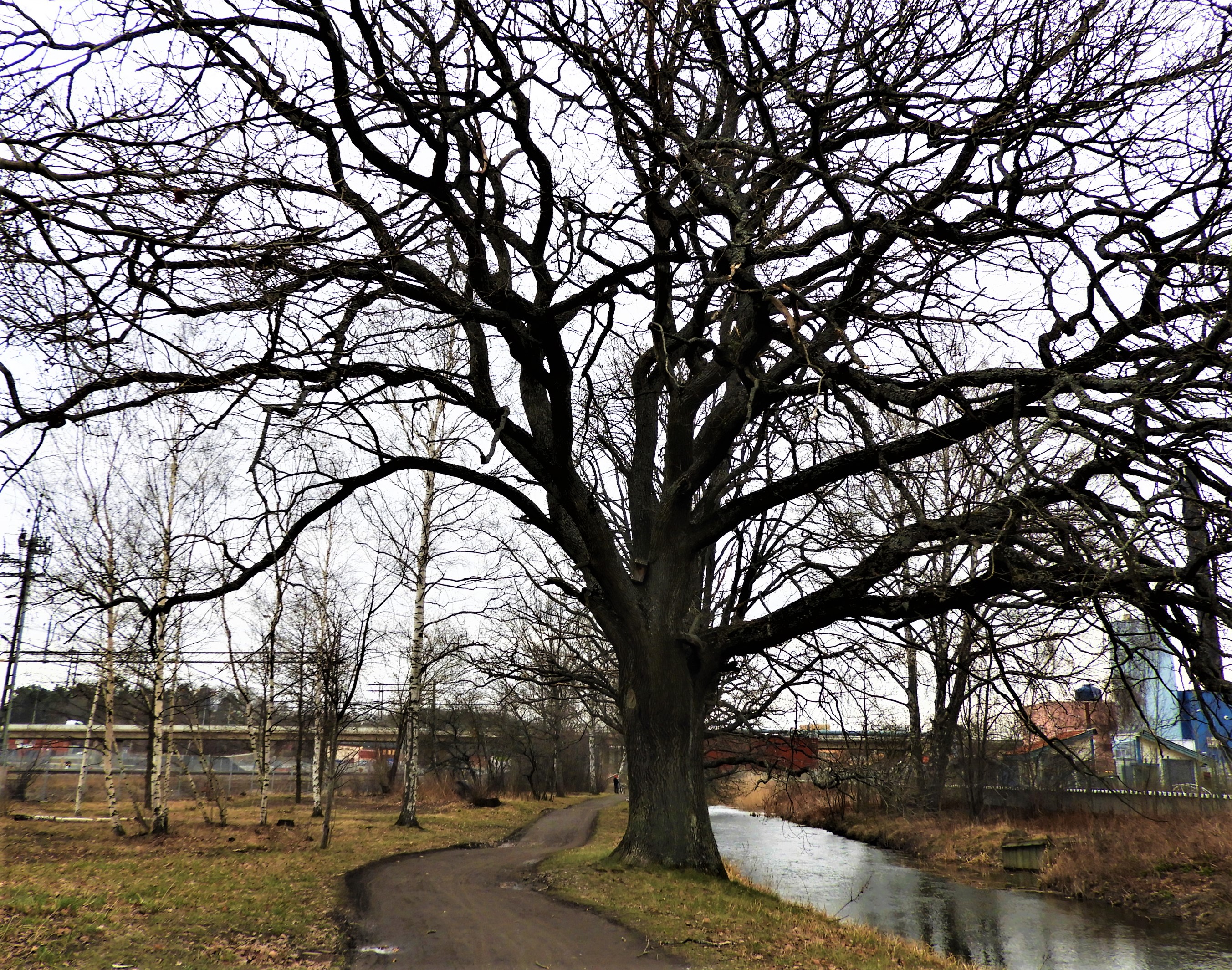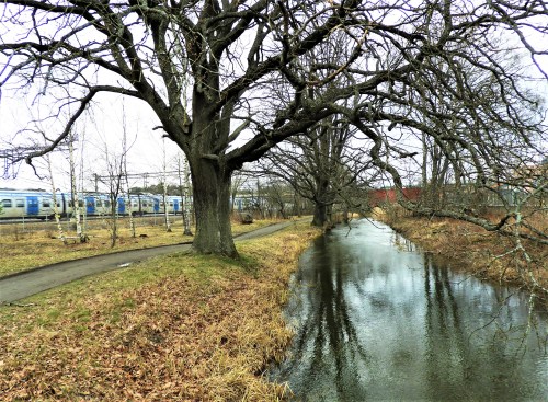 De är större än vad som går in på en bild och kronorna hakar i varandra, avstånden räcker inte. Hur kan det ha sett ut här innan järnvägen kom till och hur länge har ån varit spikrak här? Ekarna är gamla, har de planterats utmed ån eller har de bara råkat gro där? Gräsmarken mellan ån och järnvägen som man röjt lite på senare tid är full av yngre ekar i alla åldrar.