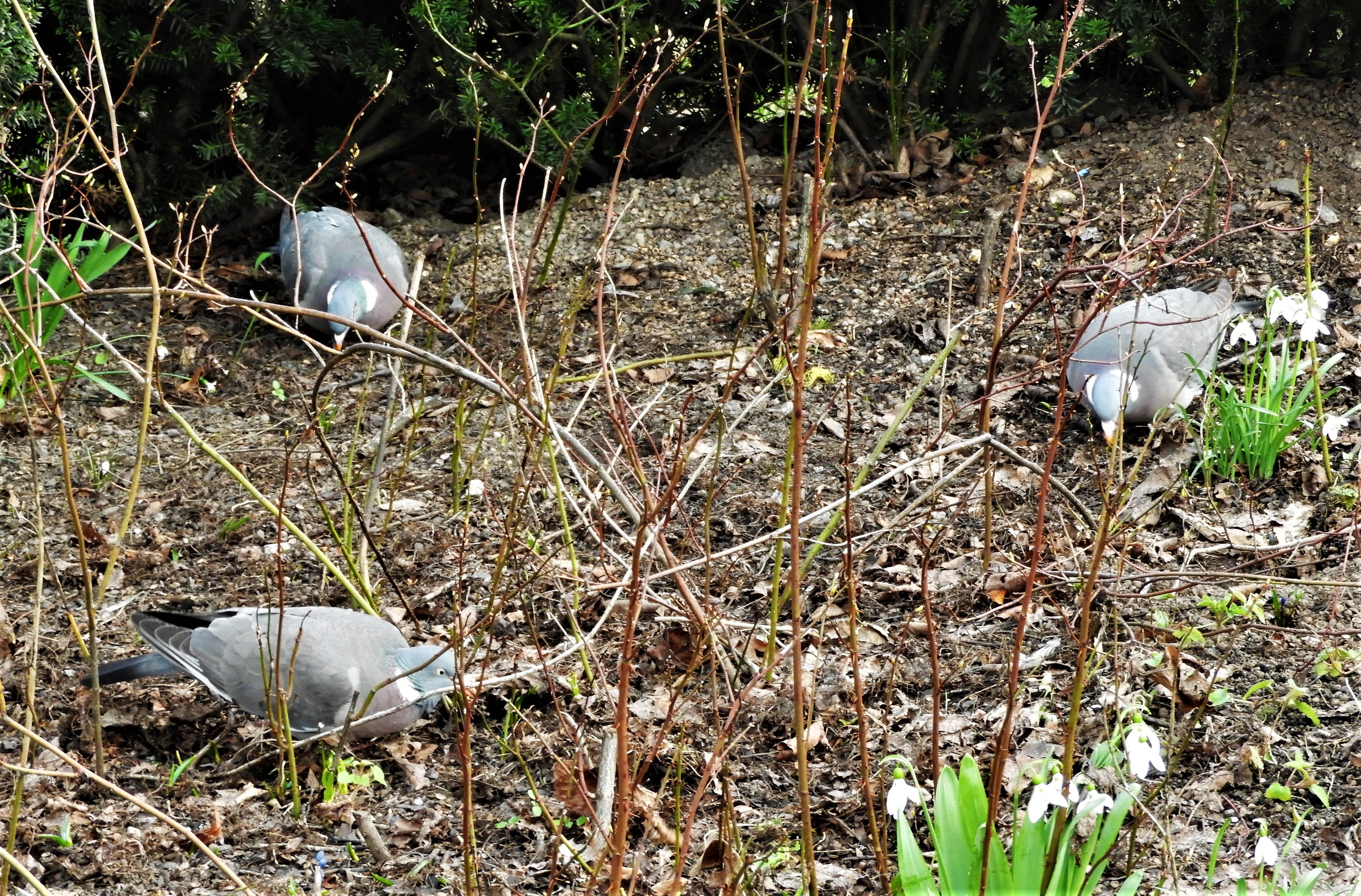 Sneddar genom Suseboparken, påskliljor är på väg att slå ut men har en bit kvar, det prasslar bland gamla löv och där går en rund ringduva och pickar frön och eller något. Sen ser jag en till och en till, de är nog en liten familj. De liknar den gamla träleksaken, en rund bräda med en kula i snöre under och på brädan fyra pickande fåglar som nickar och pickar vartefter kulan rör sig.