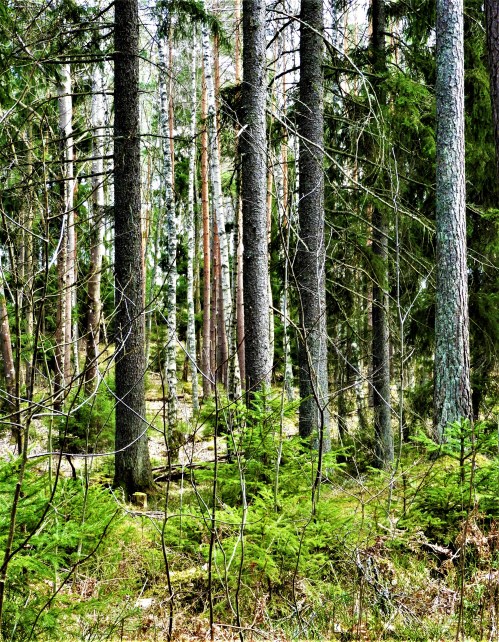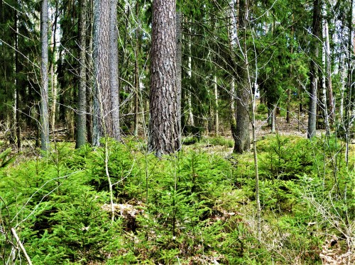 Här står de nya smågranarna och väntar på sin tur. Inga vårblommor i den här delen av skogen, men mycket knoppande blåbärsris som jag inte kunde låta bli att ta med mig ett par kvistar av.