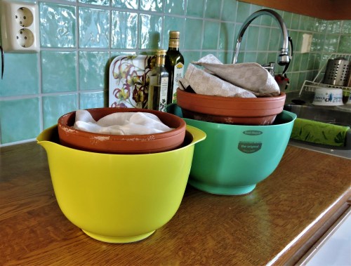 Massan innehåller kvarg, äggulor, socker och vilka fyllningar man har råd att ösa i, nötter, mandel, korinter, citronskal, vanilj, suckat och smetana, i stort sett detsamma  som man lägger i en engelsk fruktkaka till jul, ett lyxigt överdåd alltså.  Sen ska allt ner i ett durkslag och stå över natten och rinna av, då blir massan fast. Mitt durkslag är för litet så jag skurade ur ett par blomkrukor och lät massan rinna av genom en servett.