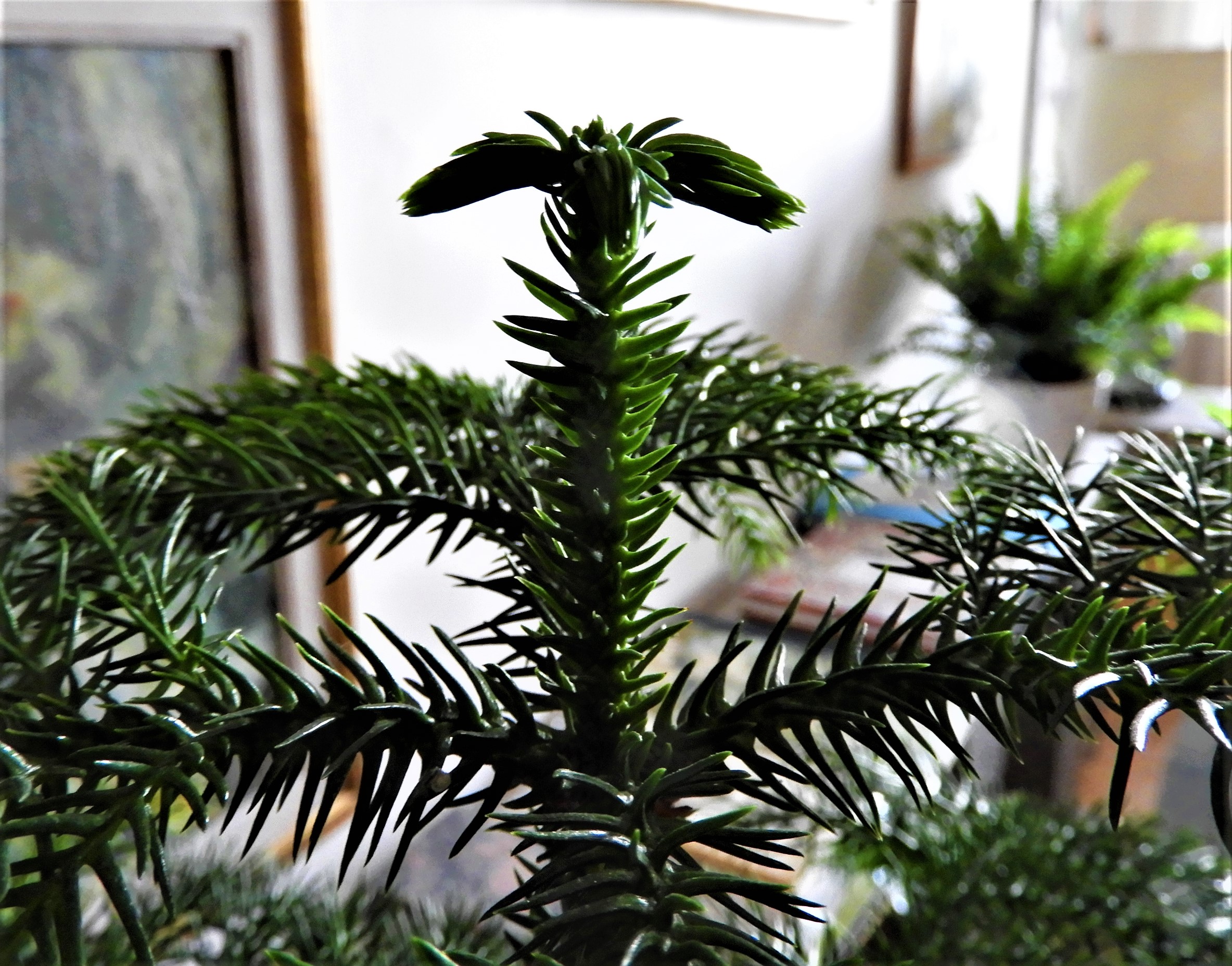 Här är en annan växt som kämpar vidare inomhus och som tar tid på sig, rumsgranen. Nu tänker den göra en fjärde grenvåning och jag har inväntat att den lilla tofsen längst upp ska dela på sig och visa att den ska sprida sig åt fyra håll.