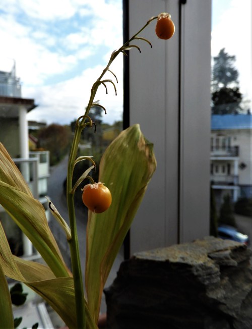 Liljekonvaljen i julveckan från Rappnes och Stina ville fortsätta att leva och fick två bär och de måste få mogna och plantan har hamnat i en balkonglåda. Bären börjar nu få färg och tänk om vi kan så en konvaljedunge nere på gården!,