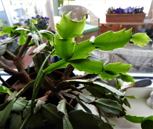 Novemberkaktusen innanför fönstret med många år på nacken, som jag skött med vänster hand men som blommat ett par gånger om året bredde ut sig ohejdat. För att kunna finnas kvar som krukväxt fick den en rejäl nerklippning. Efter att ha samlat sig ett bra tag satte den igång att återskapa det nerklippta och den skickar nu ut hela knippen med blad och grenar från de kapade ställena. De ljusgröna bladen har kommit på nolltid och snart är växten lika stor som före klippningen.