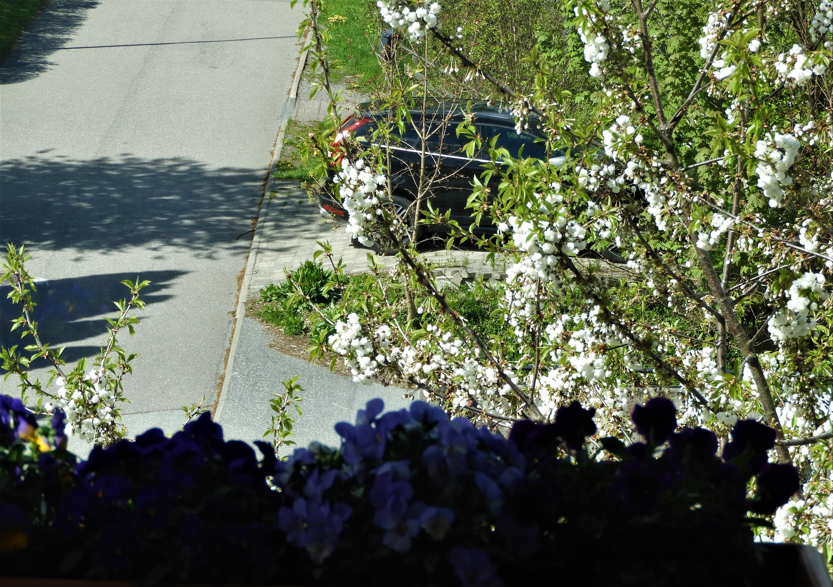 I år har gårdens körsbärsträd nått upp till min balkong och inifrån ser det ut att höra till min trädgård