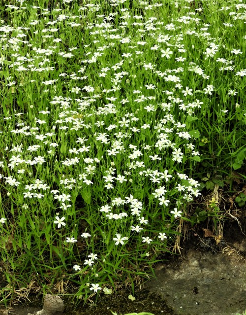 Japanska dammen har två präktiga ormbunkar vid brofästet, egentligen drog mig ormbunkarna lika mycket som pionerna den här gången. Vintern har gått helt i ormbunkarnas tecken för mig och här är de nu just upprullade. Jag går mot deras boplatser och på slänten blommar något vitt, vad är det?