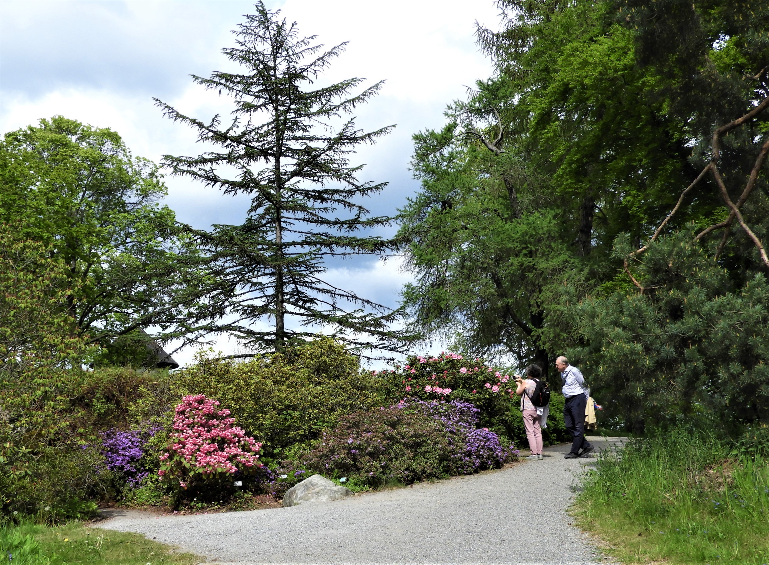 Jag sneddar genom Rhododendrondalen upp till trädgårdens övre våning, där några sena buskar lyser med mycket färg.