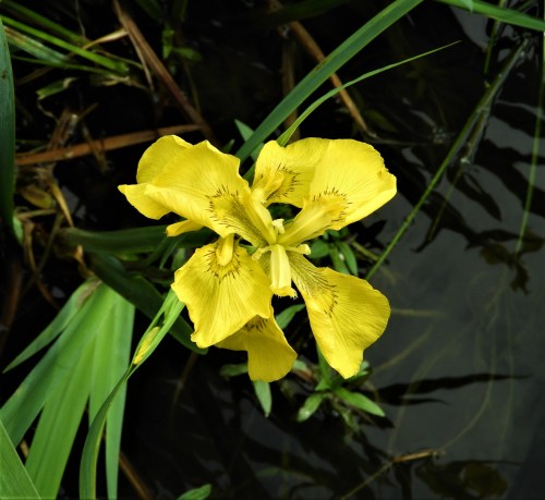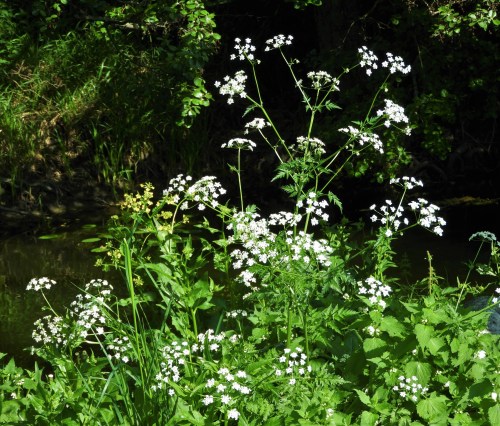 Marken och träden är gröna och nu är försommaren här, jag har inte gått utmed ån sedan i mars och då var ekarna just så kusligt svarta och knotiga som nakna gamla ekar utan löv är och marken var utan synligt liv. Nu blommar gräs och ogräs och kramar oss från båda sidor av gångvägen med buketter av gula och vita blomster.