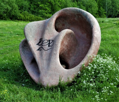 Då man passerat en bredare bro över ån ligger en av Axel Nordells skulpturer i gräset, formatet framgår inte riktigt av bilden. Axel Nordell, skulptör levde, bodde och tillverkade sina lekskulpturer vid Harby gård i Väsby, läs mer om honom här.