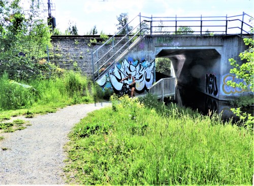 Här svänger ån in under järnvägen och en gångbro av trä följer med på ena sidan. Därefter är gångvägen inte längre hjulvänlig och det är lagom att vända och gå samma väg tillbaka. Solgasset bländar ofta när man går söderut och då man vänder ser ögonen en del de inte uppfattat längs vägen. Nära kröken där ån går in under järnvägen har Upplands landskapsfisk, den rödlistade aspen fått en lekplats. Aspen är en karpfisk som fått sitt namn av att fjällens mönster liknar aspträdets bark (Wikipedia). Man har gjort en småstenig botten på en sträcka av ån, där kan äggen ligga skyddade och med större sten har vattnet fått lite fors. Det var lågt vatten igår men ändå tillräckligt för att forsen skulle höras.