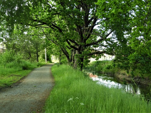 Går utmed Väsbyån söderut och började vid Mälarvägens bro över ån och järnvägen. Vid en gångbro över till Marabou glimtar gula svärdsliljor fram bakom algrönskan. Svärdslilja (Iris pseudoacorus), Linné säger att kreaturen lämnar den orörd, när allt annat är uppätet.