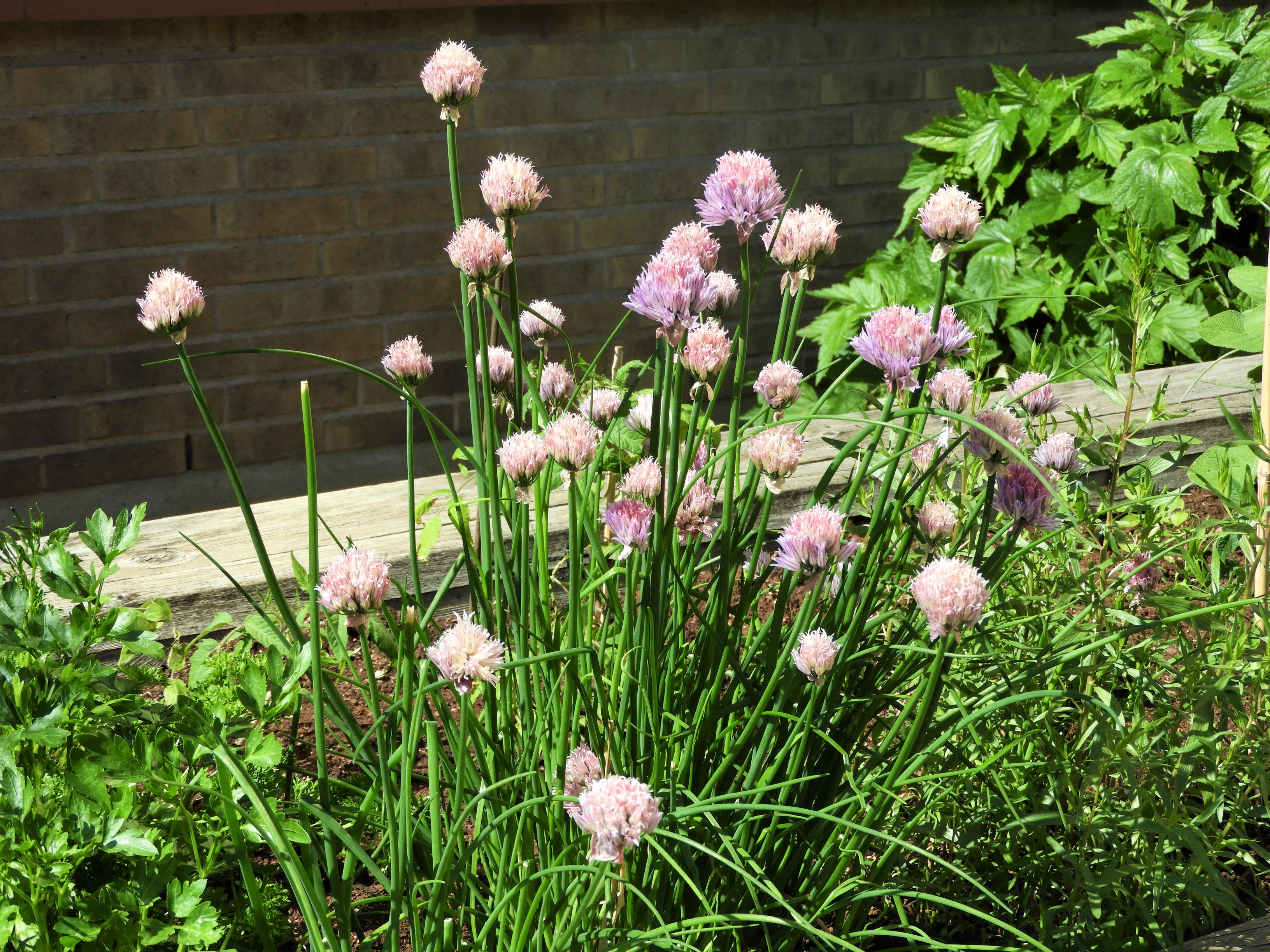 Gräslöken blommar i kryddlådan. Kryddor av många slag i midjehöjd, alla med doft och smak, det är inte förbjudet att nypa av blad och smaka.