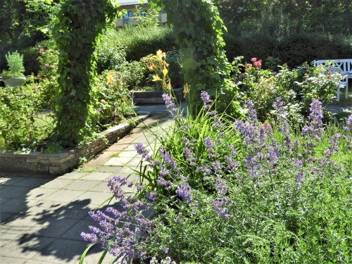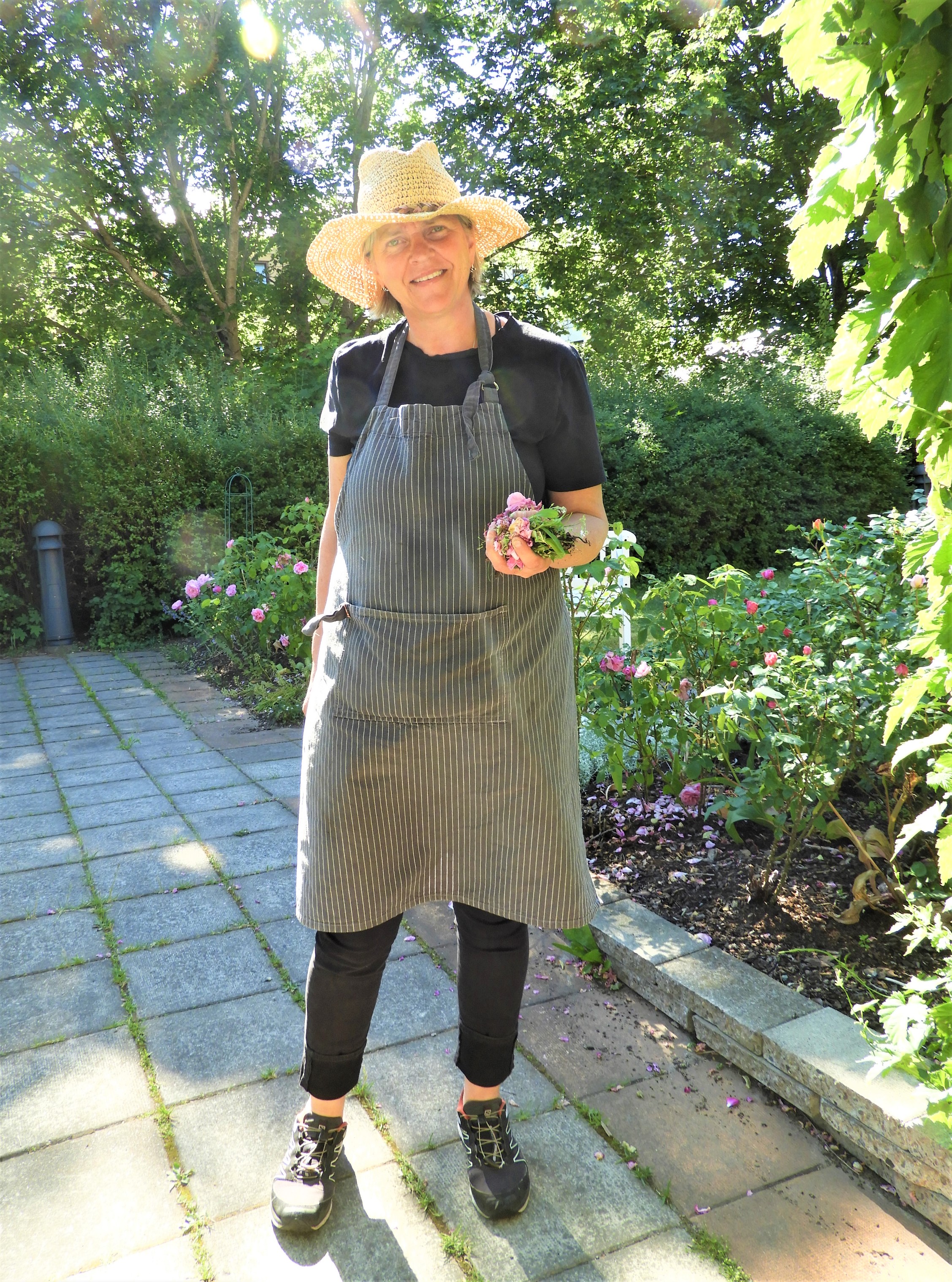 Karin sköter trädgården, som anlades 1980 för patienter på Dalens geriatriska sjukhus och i dessa tider har den även blivit en oas för stunder av återhämtning för den hårt ansträngda personalen.  Fler stolar i trädgården, vilstolar, nya hammockar, varje skrymsle i både ljus och skugga upptas nu vid lunchtid och för kafferaster av personal som här får ett välkommet avbrott .Gåsen stod på de nakna stenplattorna senast jag såg den, men nu har den fått myskmadra och timjan kring fötterna.
