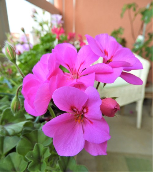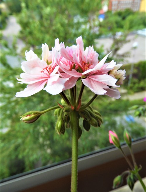 Där ropar större och mindre krukor konstant på vatten så där behövs jag mer än i skogen. Alltså blir jag kvar.  Drömmen om en balkong med olika fetblad och taklöksvarianter har jag efter ett par år vaknat ur. Längtan efter färgkaskader blev övermäktig så jag gick och köpte pelargoner eller ”pellisar” som jag till slut förstod vad det betyder.