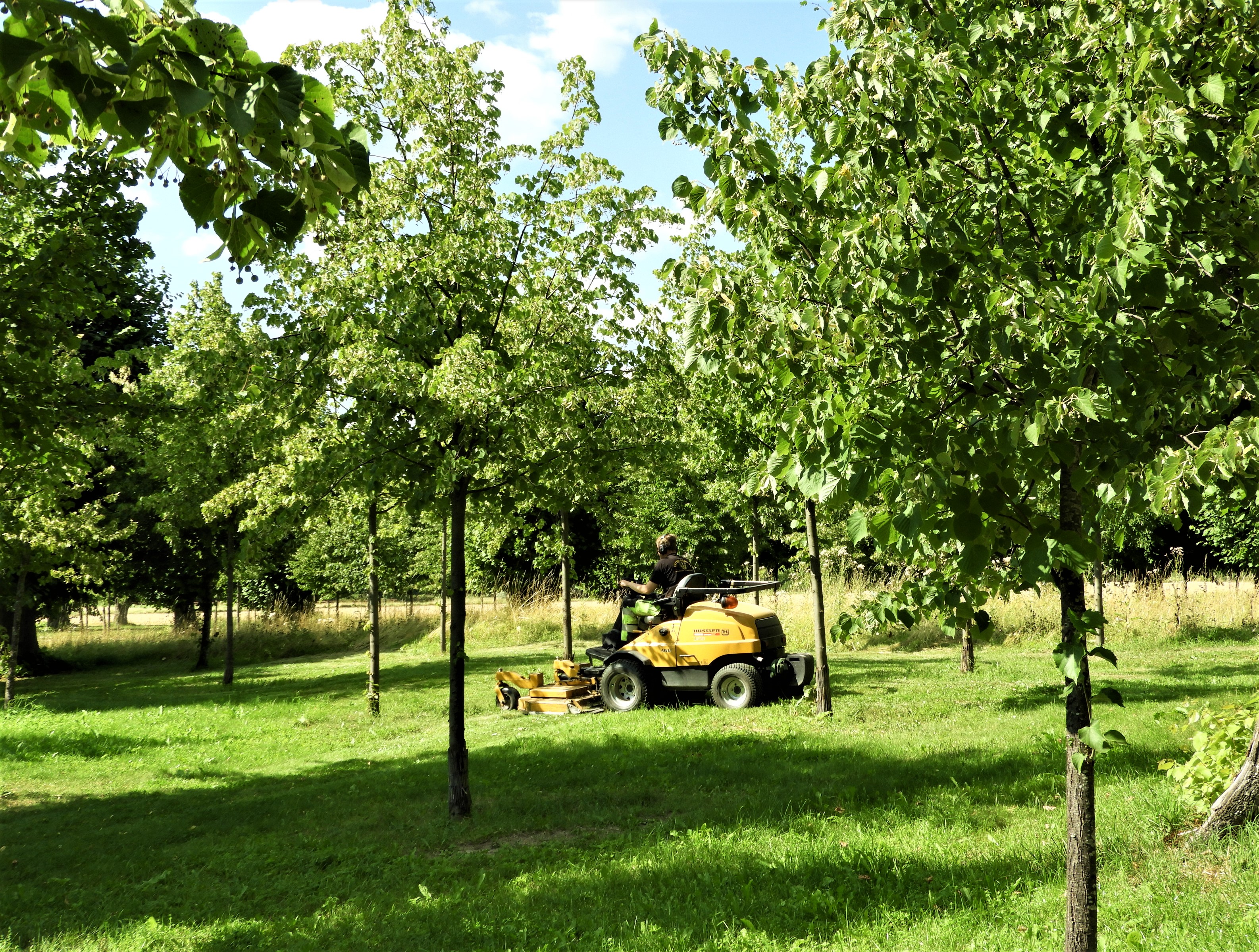 Karin har inte sett Stora Väsbys renoverade barockpark, så vi gick dit en av de gassiga augustidagarna och såg att marken mellan träden var grön och slät som ett golv. Det brummade lite och rörde sig mellan träden, en klippmaskin styrde runt de gamla och nya lindarna och gjorde marken inbjudande att gå på. Vi gick in i grönskan för att slå oss ner i skuggan där gräset var klippt och hörde då en till klippare fara omkring och efter en stund även en tredje. Det är en stor yta och tre maskiner behövs för att klippa området på rimlig tid.