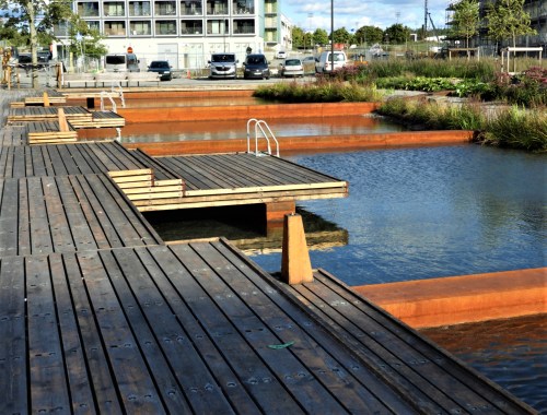 Dammen är delad i flera bassänger med varsin stege ner till vattnet, det ser inbjudande ut att ta sig ett dopp, ska det verkligen vara möjligt?