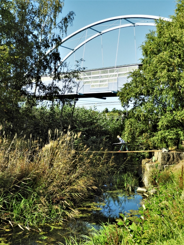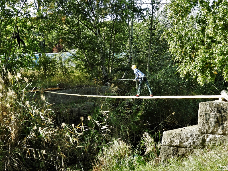 Något pågår nere mellan de gamla brofästena vid ån. någon balanserar på en smal bräda högt över ån som just nu står stilla