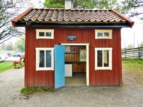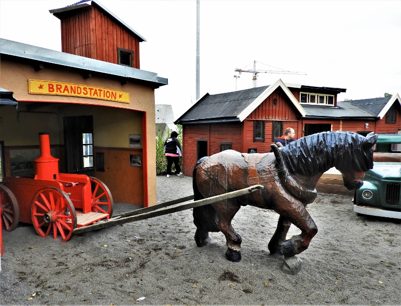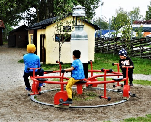 Här trampar barnen karusell, kring en modell av Optimuslampa och intill ligger Konsumbutiken.