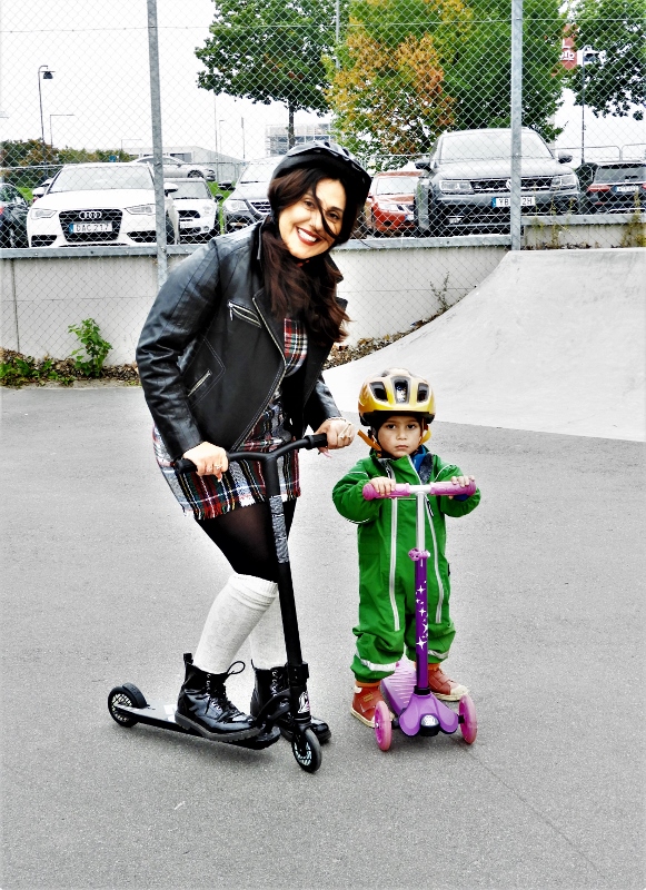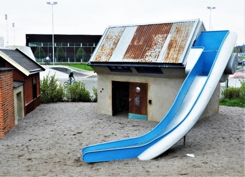 Området invigdes 2018 och tillsammans med den guppiga cykelbanan är de grannar med simhallen. Lördag med regndis i luften, ser jag barn överallt med pappor, någon enstaka mamma men mest pappor. Barnen flyttar sig fort in och ut ur husen och även ovanpå, men eftersom det kan vara känsligt att lägga ut bilder på barn, ger platsen intryck av att vara öde..